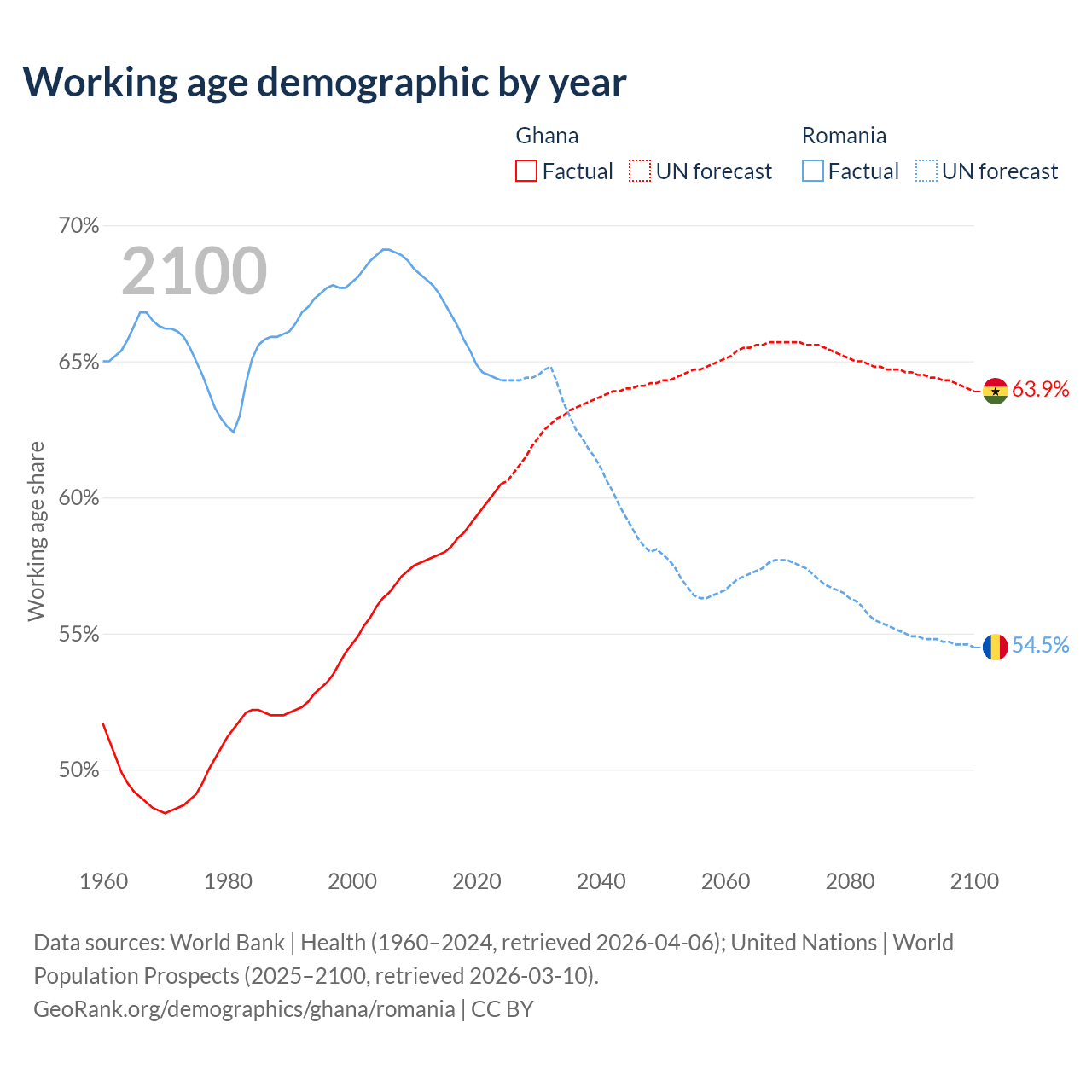 - Ghana has 21.7M working age adults (aged 15-64) vs 12.1M in Romania.