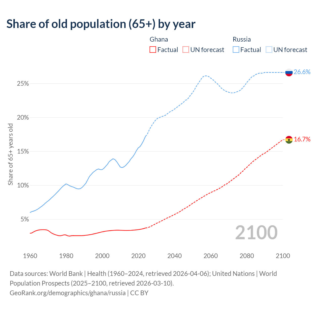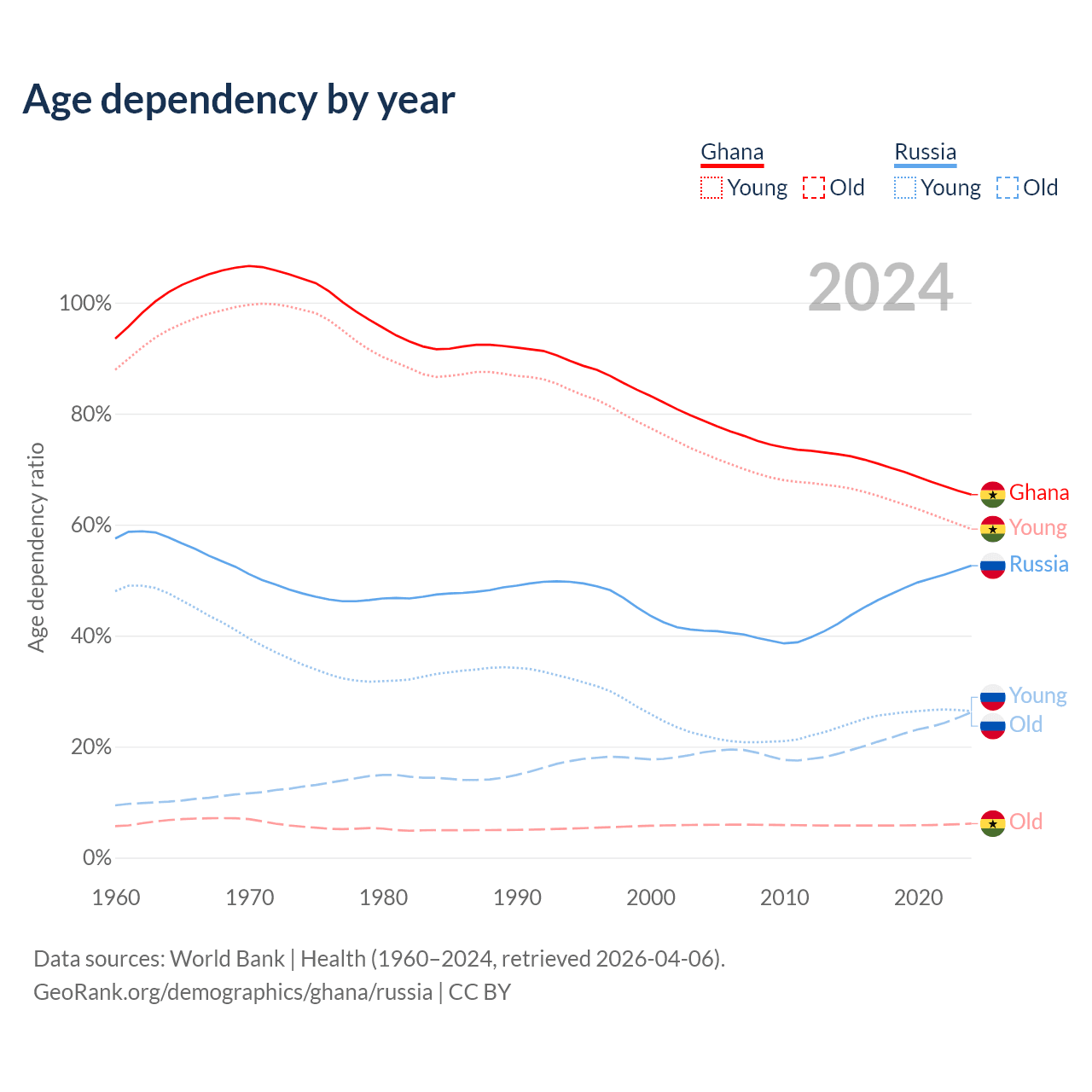 The share of older people aged 65 and over is 3.71% in Ghana and 17.2% in Russia. Life expectancy in Ghana compared to Russia .