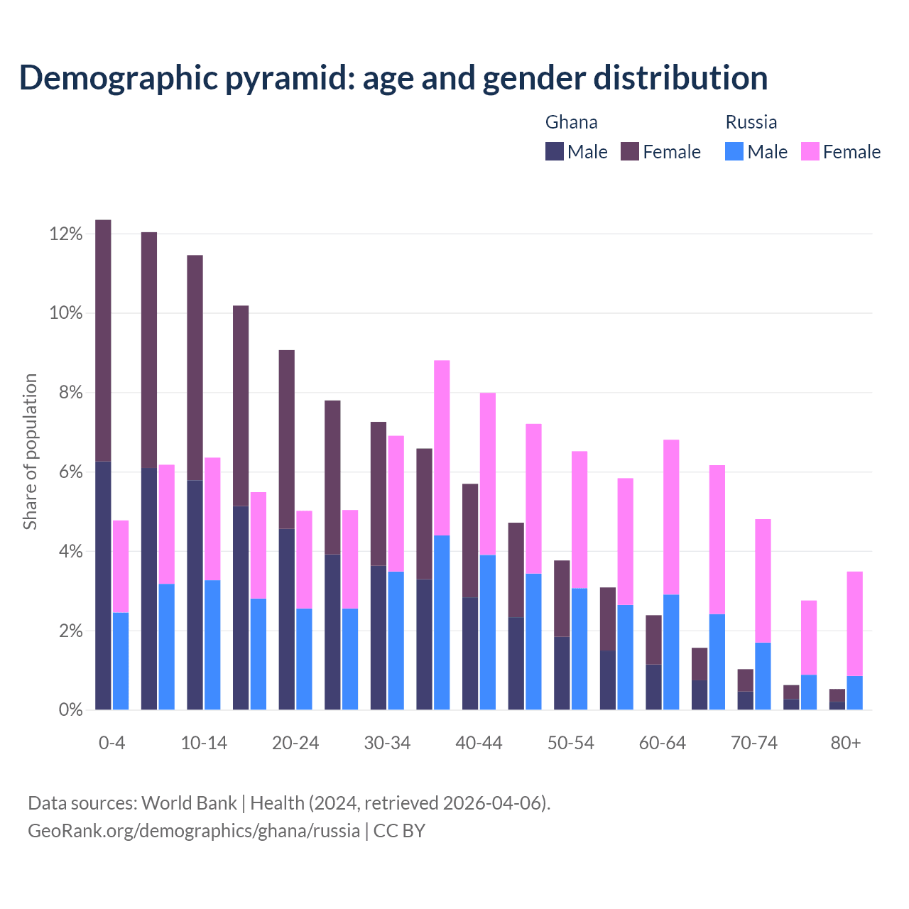 - Ghana is ranked 146/196 by median age (oldest to youngest) vs 42/196 for Russia.