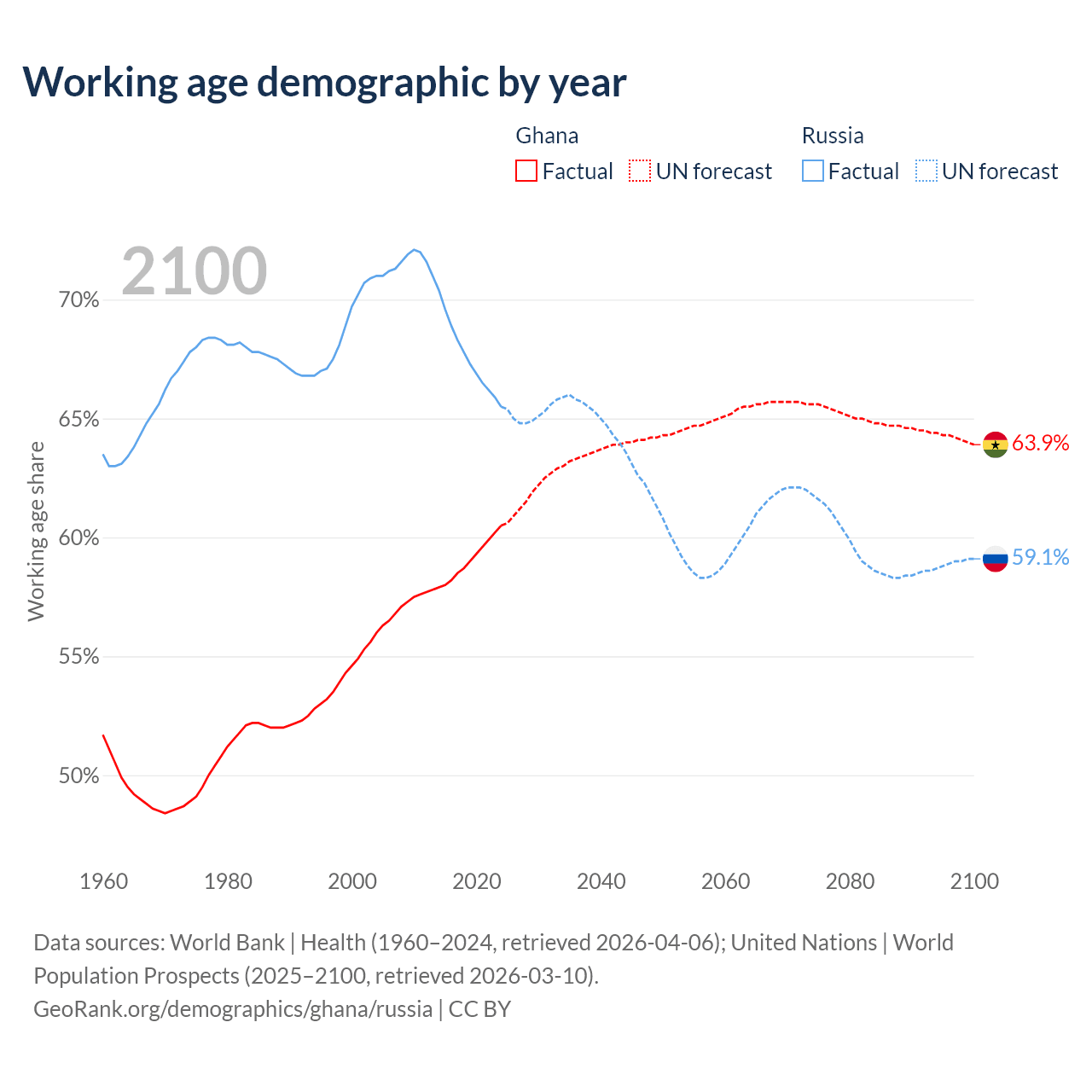 - Ghana has 21.7M working age adults (aged 15-64) vs 93M in Russia.