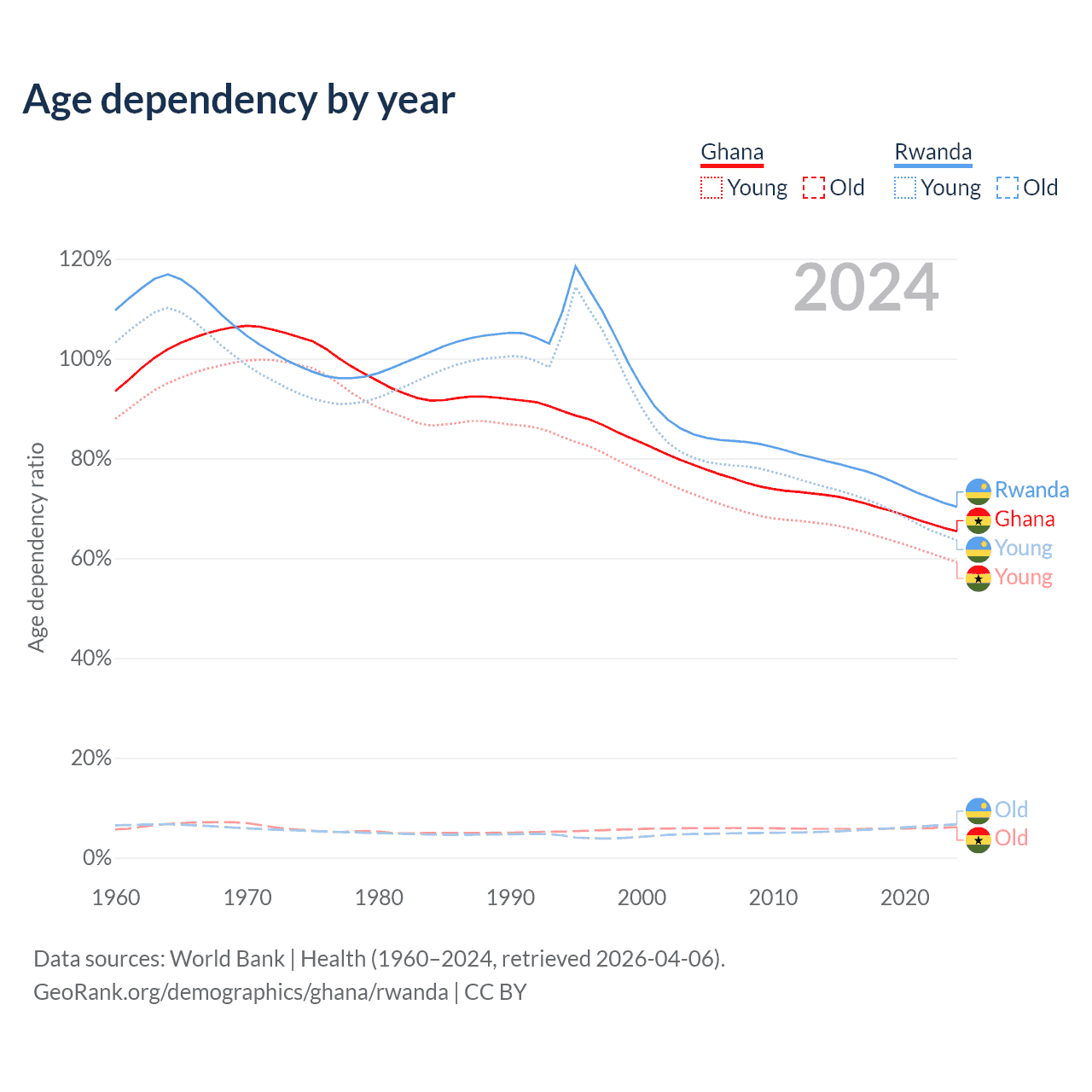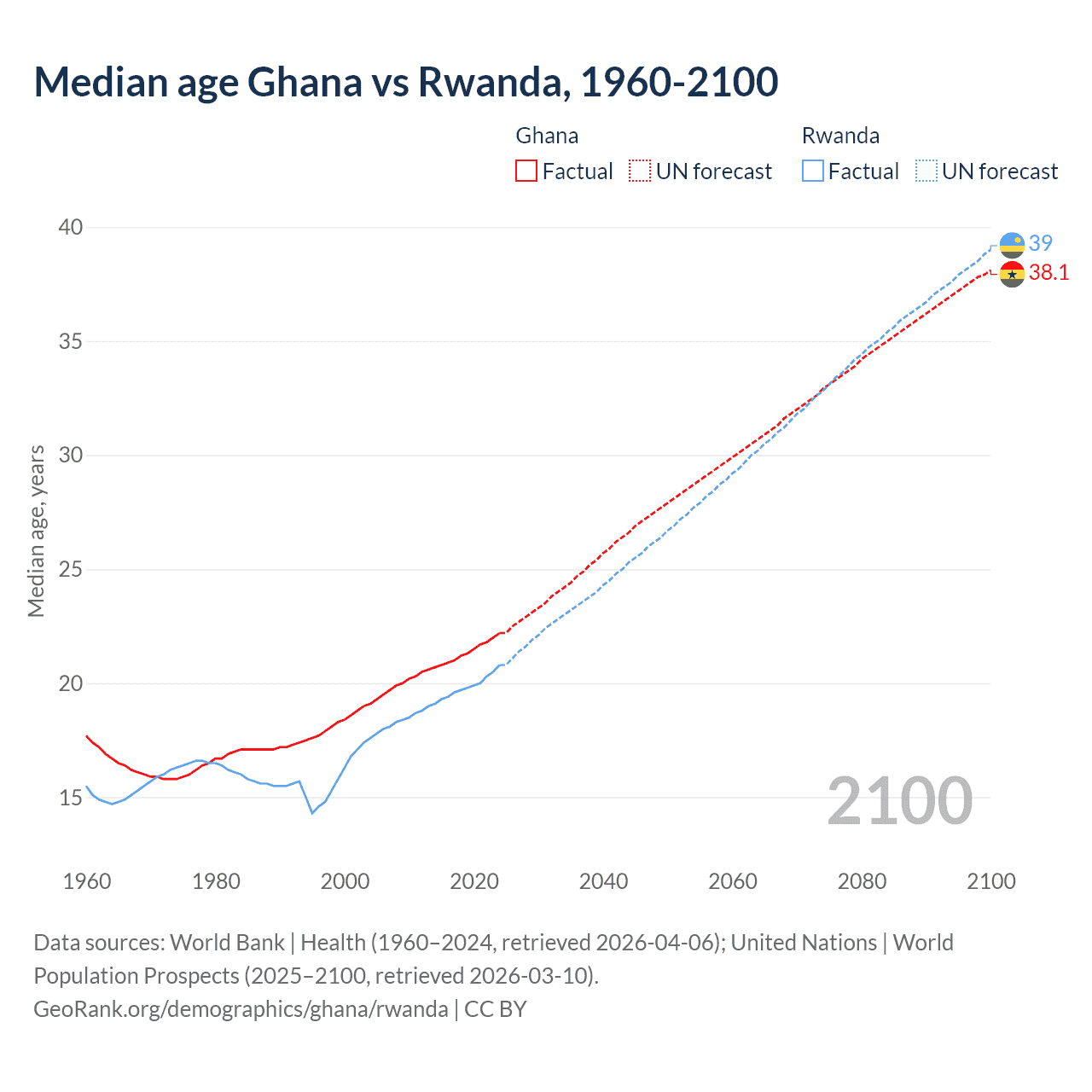 - Ghana is ranked 146/196 by median age (oldest to youngest) vs 160/196 for Rwanda.