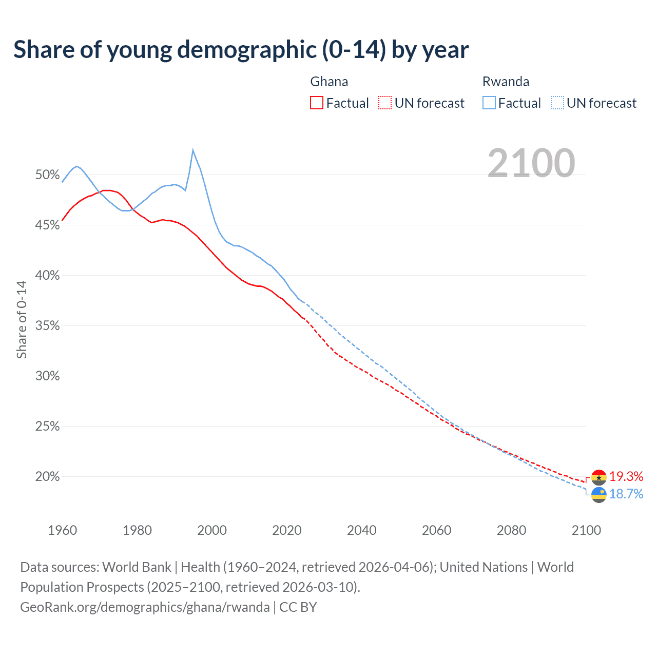 - As of 2026, the population of Ghana is 35.9M vs 15M in Rwanda - 2.4 times difference.