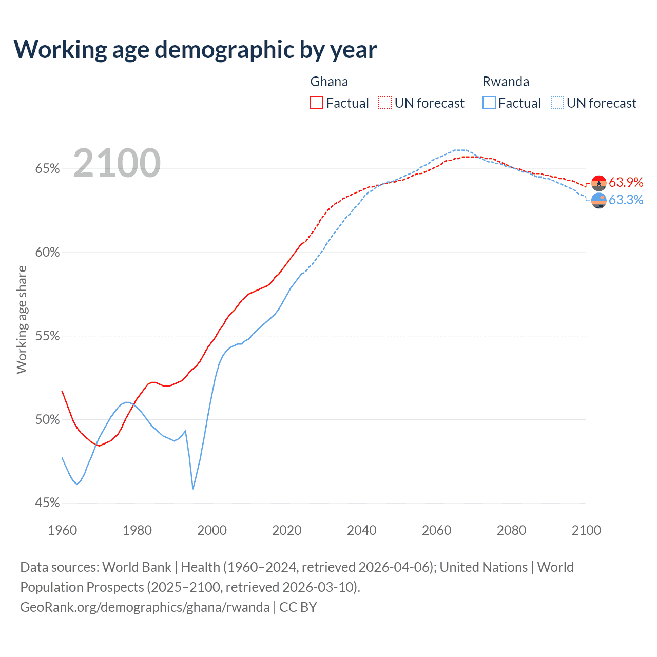 - Ghana has 21.7M working age adults (aged 15-64) vs 8.79M in Rwanda.