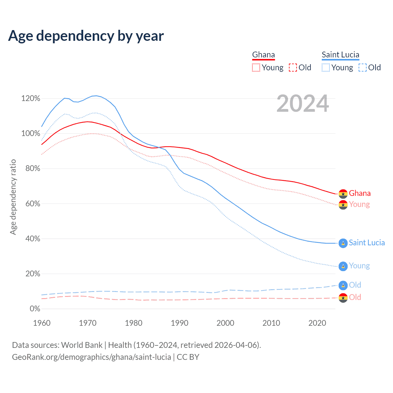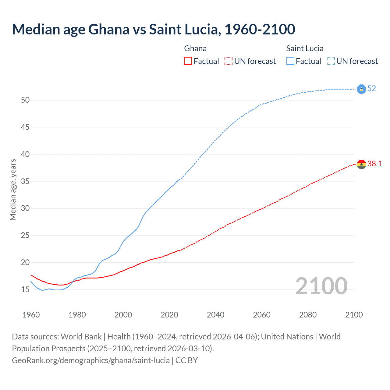 - Ghana is ranked 146/196 by median age (oldest to youngest) vs 74/196 for Saint Lucia.
