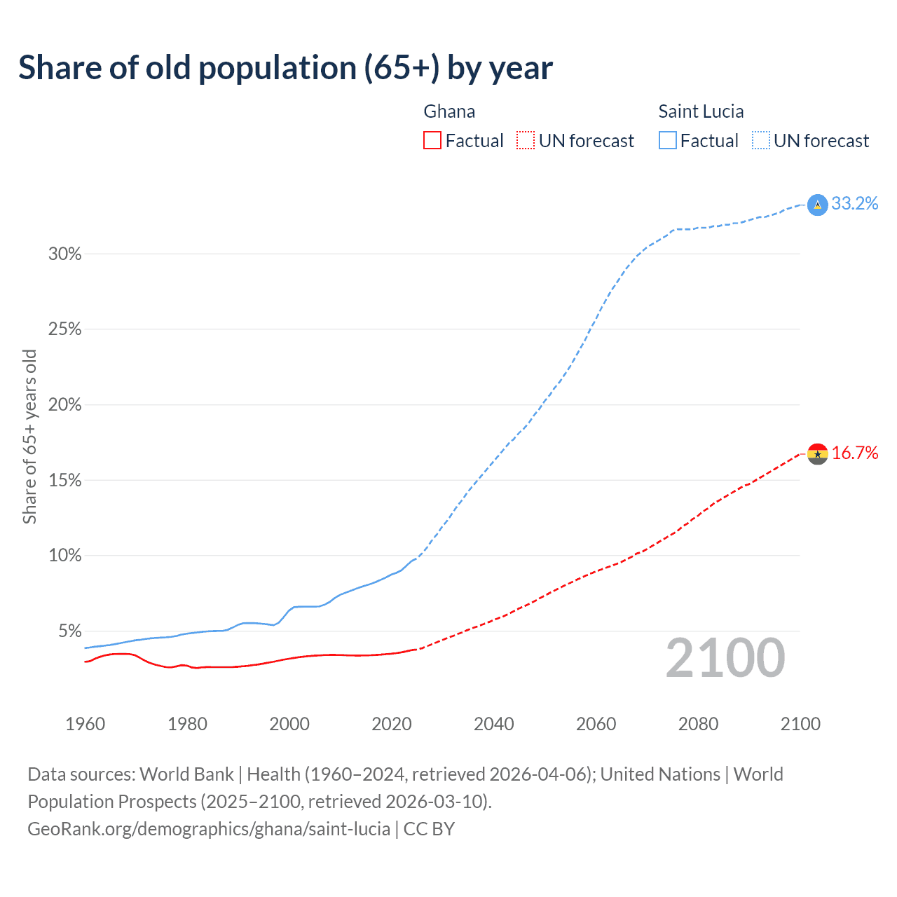 The share of older people aged 65 and over is 3.71% in Ghana and 9.62% in Saint Lucia. Life expectancy in Ghana compared to Saint Lucia .