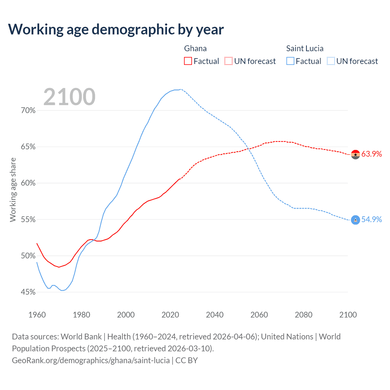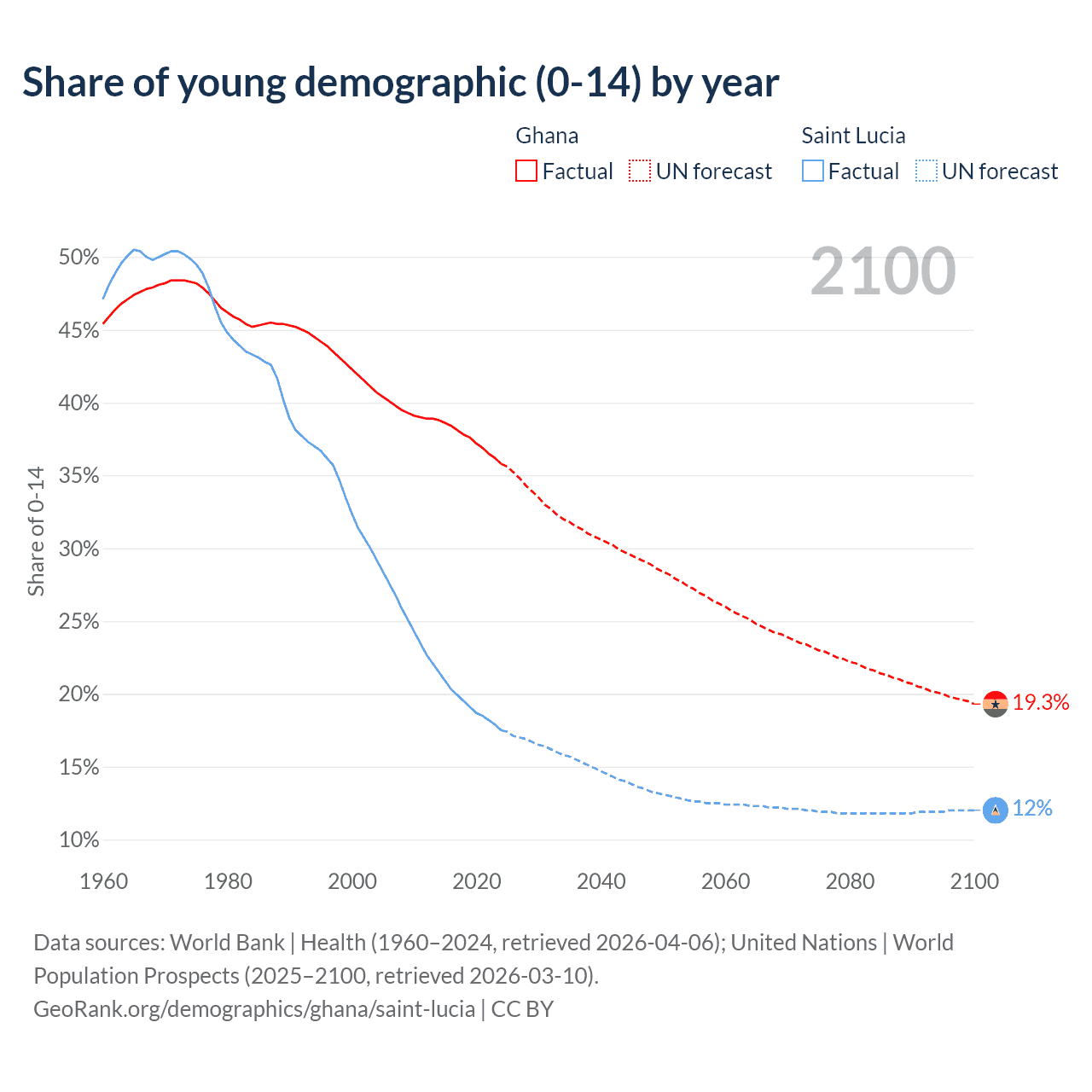 - The share of young demographic (0-15 years old) in Ghana is 35.8% vs 17.5% in Saint Lucia.