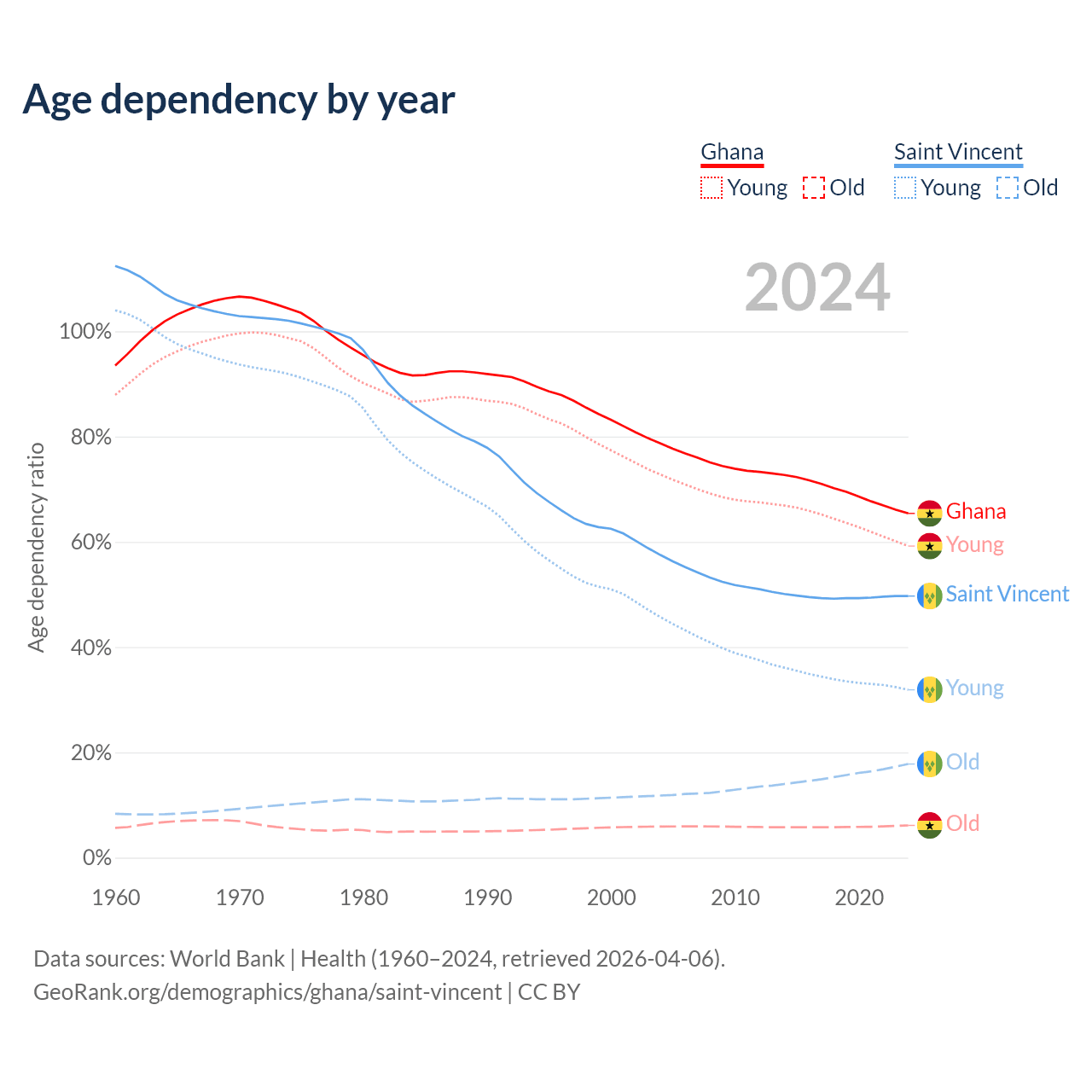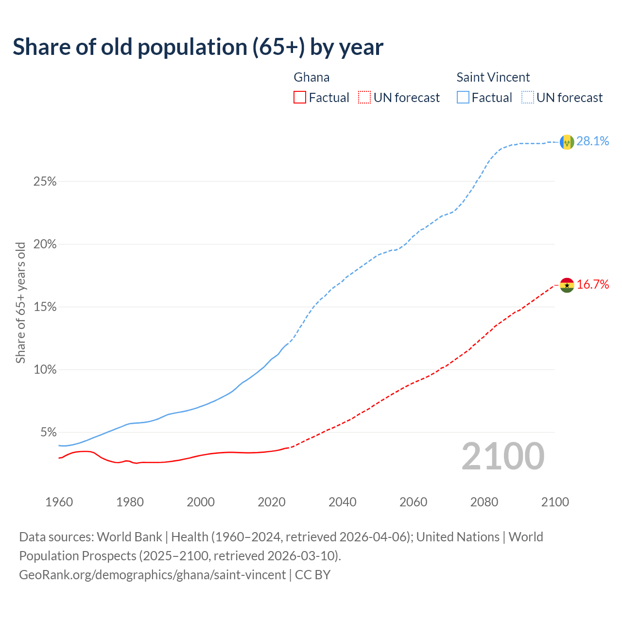 - The share of old-age demographic (65+) in Ghana is 3.71% vs 11.9% in Saint Vincent.