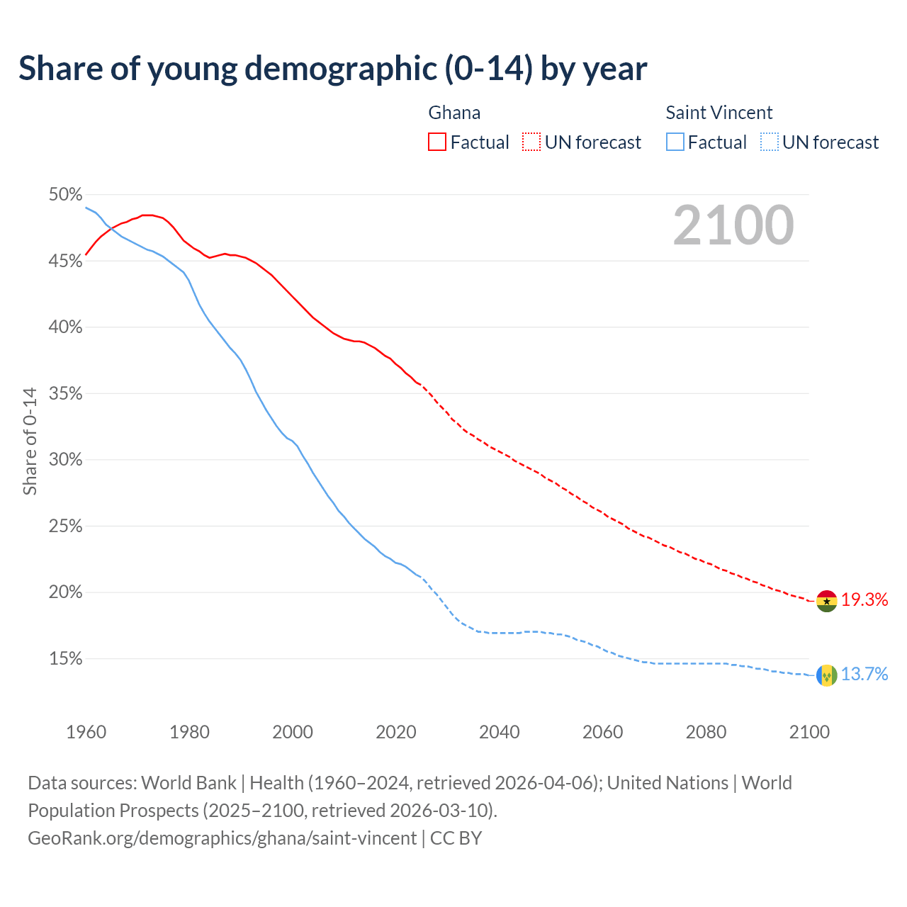- The share of young demographic (0-15 years old) in Ghana is 35.8% vs 21.3% in Saint Vincent.