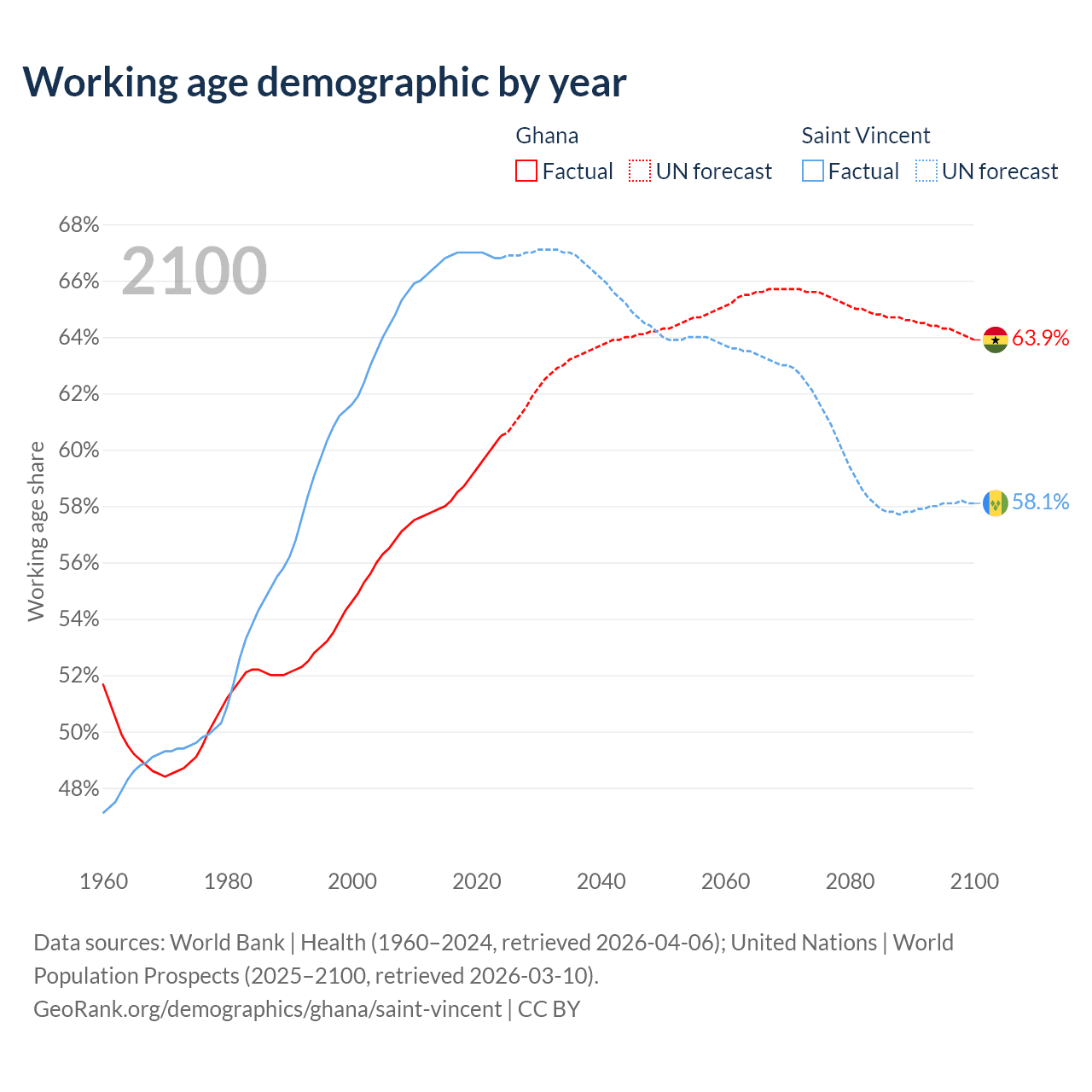 - Ghana has 21.7M working age adults (aged 15-64) vs 66.3K in Saint Vincent.