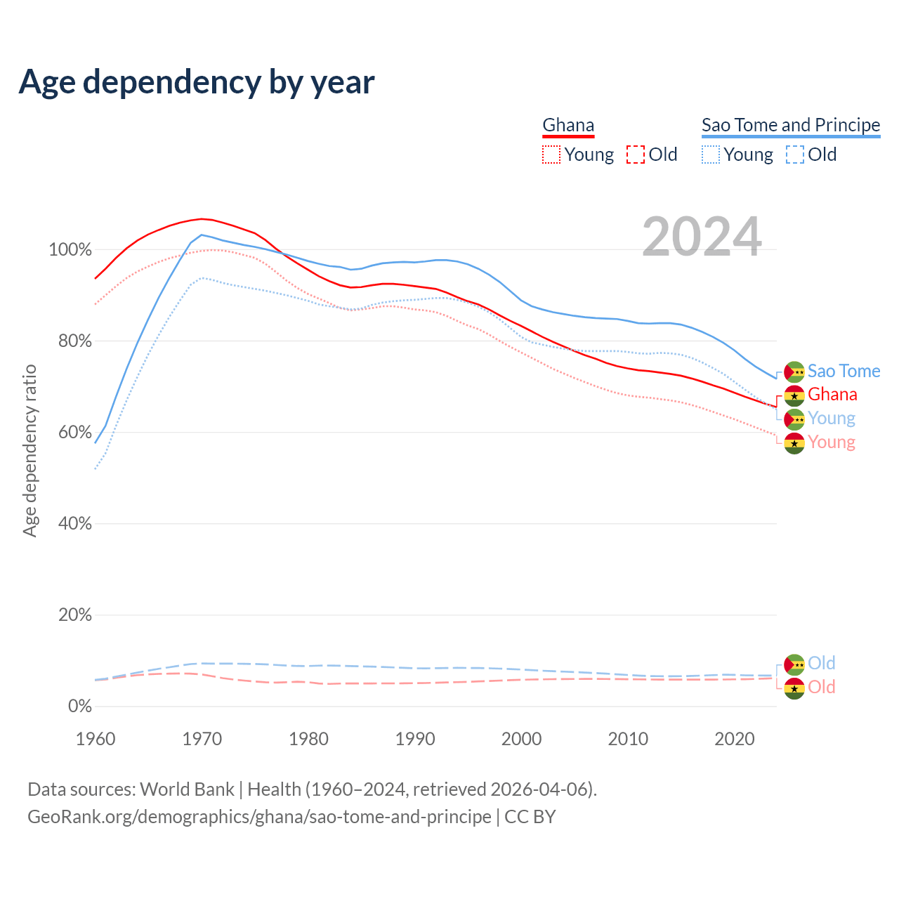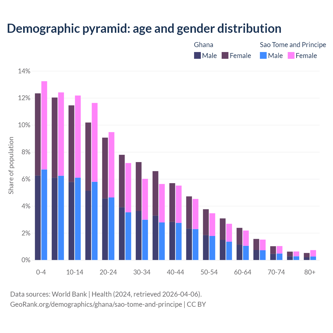 - Ghana is ranked 146/196 by median age (oldest to youngest) vs 163/196 for Sao Tome and Principe.
