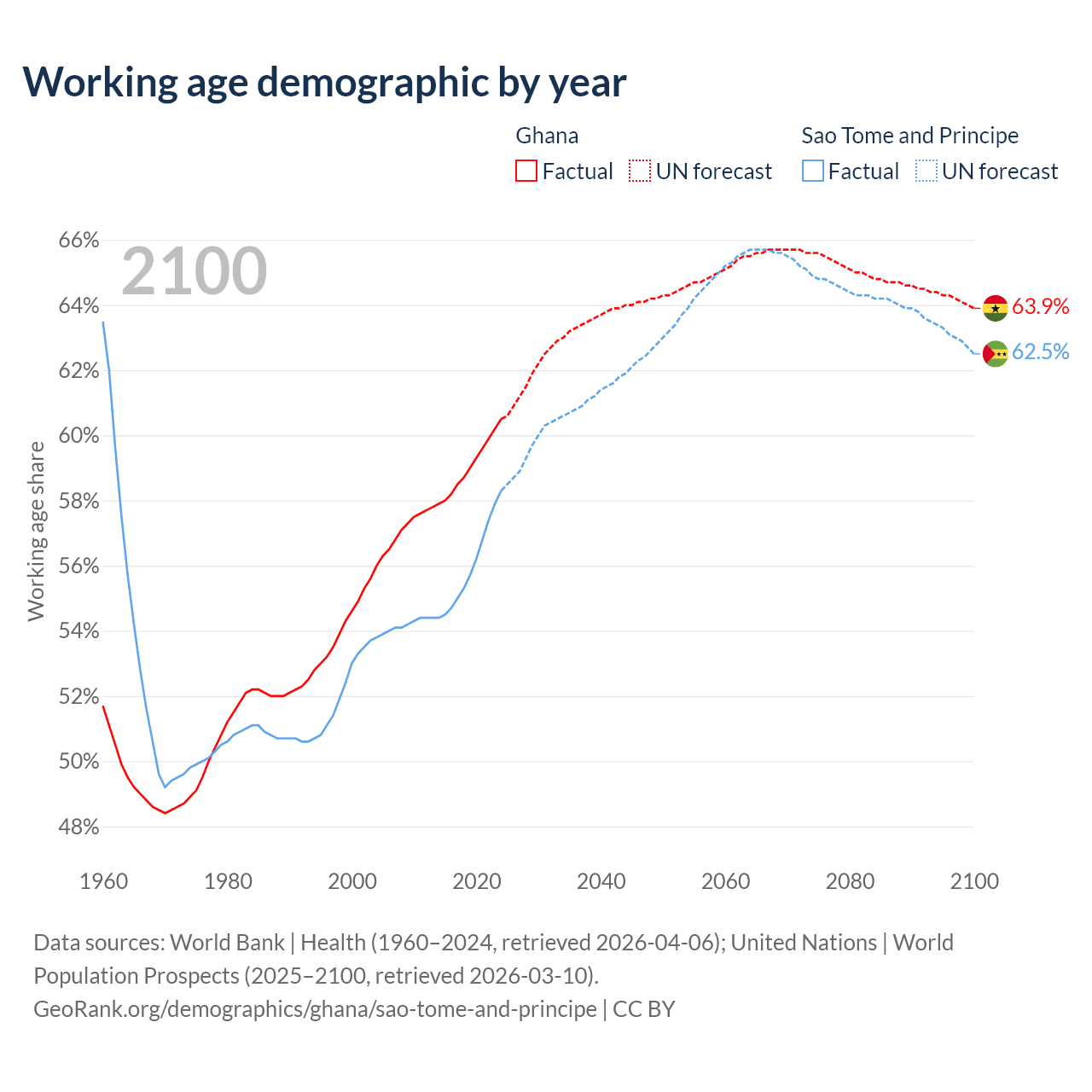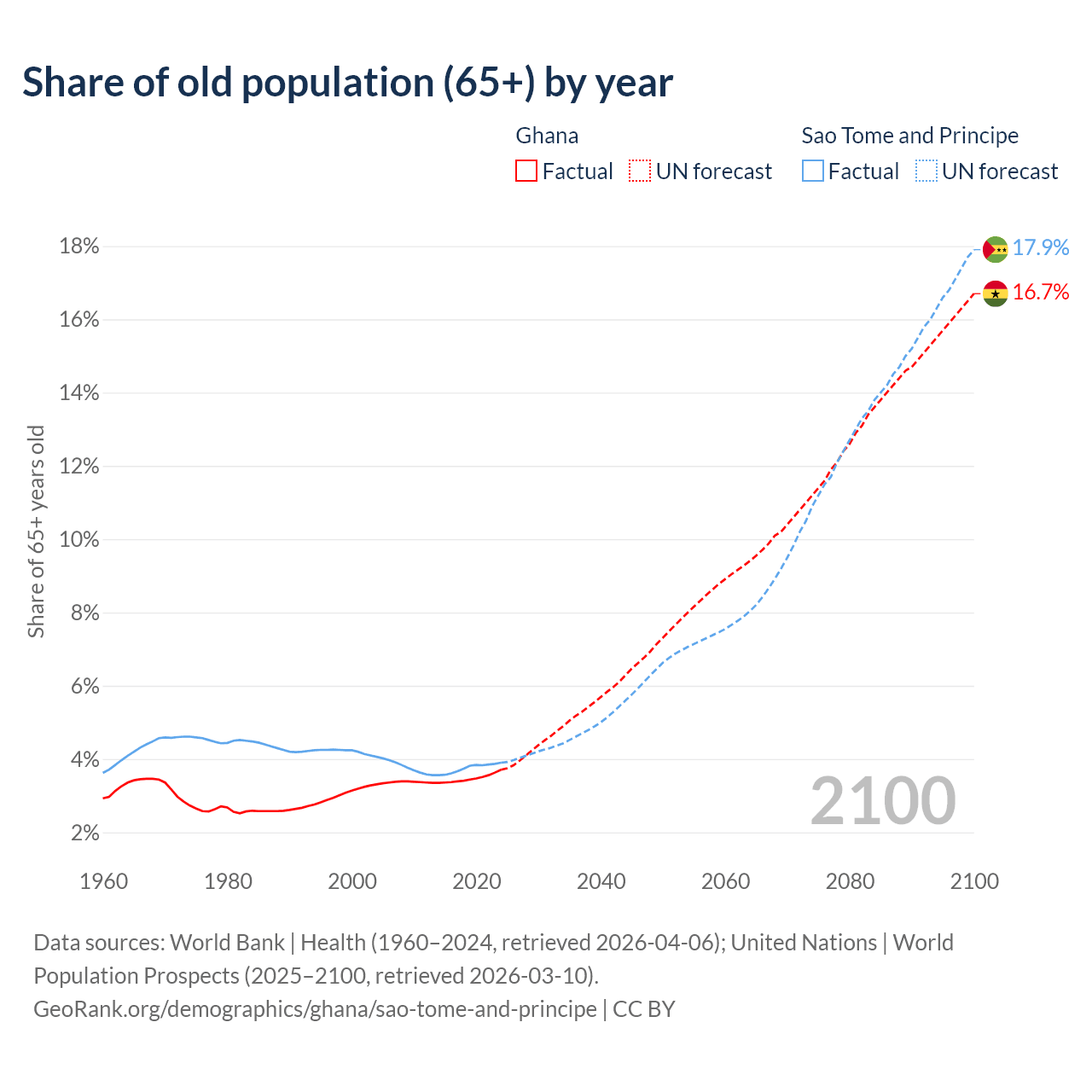 The share of older people aged 65 and over is 3.71% in Ghana and 3.9% in Sao Tome and Principe. Life expectancy in Ghana compared to Sao Tome and Principe .