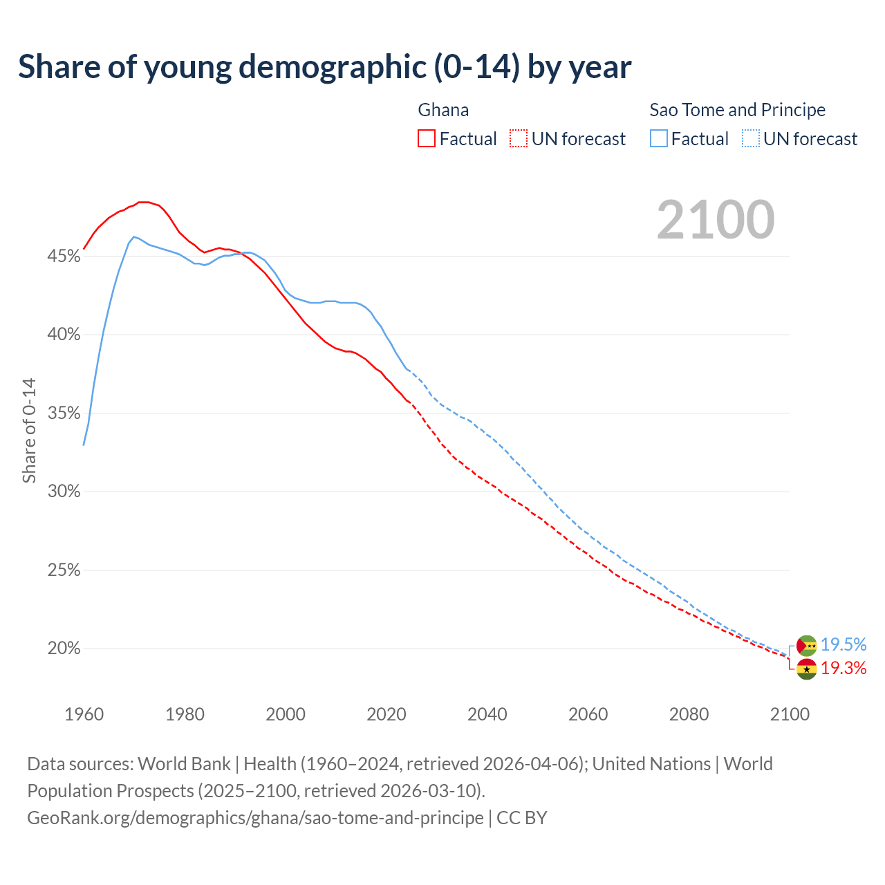 - The share of young demographic (0-15 years old) in Ghana is 35.8% vs 37.8% in Sao Tome and Principe.