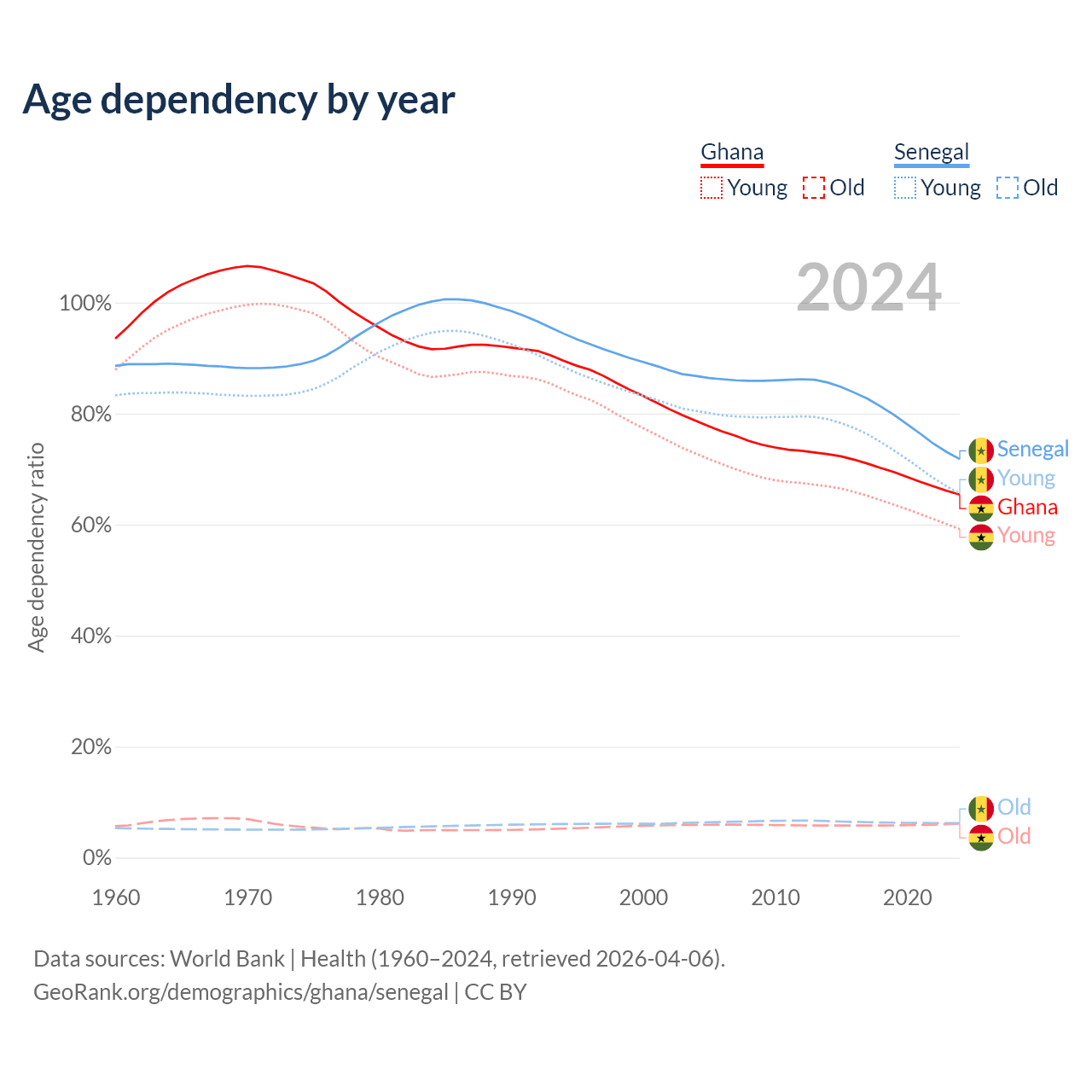- Ghana is ranked 146/196 by median age (oldest to youngest) vs 162/196 for Senegal.
