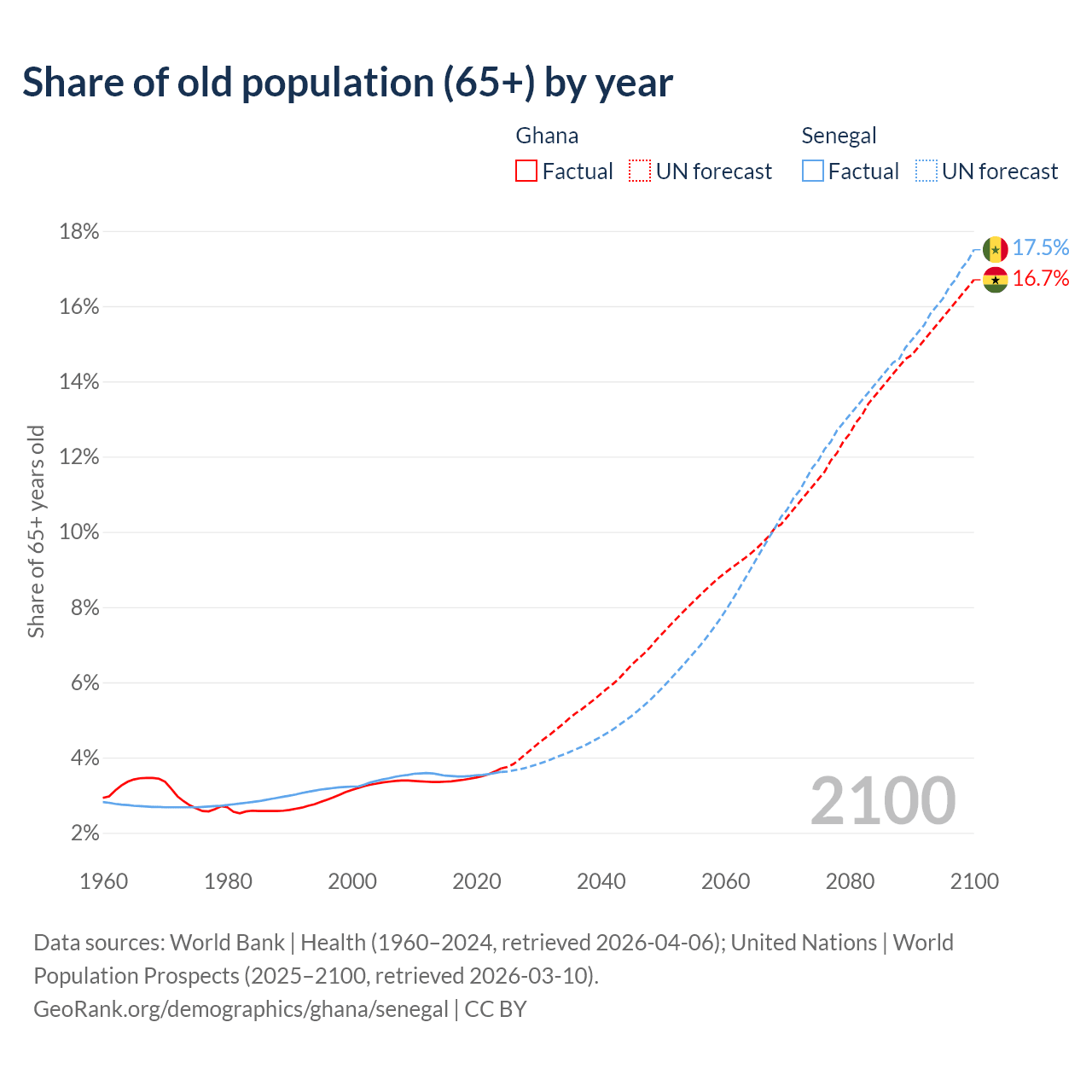 The share of older people aged 65 and over is 3.71% in Ghana and 3.62% in Senegal. Life expectancy in Ghana compared to Senegal .