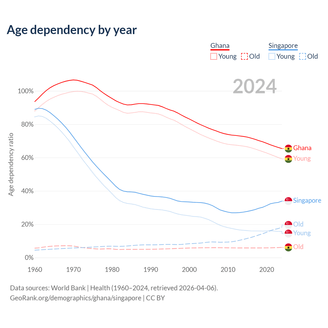 - Ghana is ranked 146/196 by median age (oldest to youngest) vs 68/196 for Singapore.