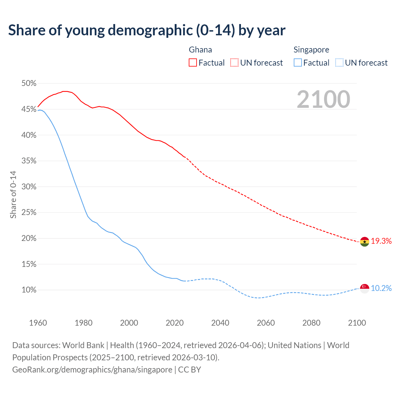 - The share of young demographic (0-15 years old) in Ghana is 35.8% vs 11.7% in Singapore.