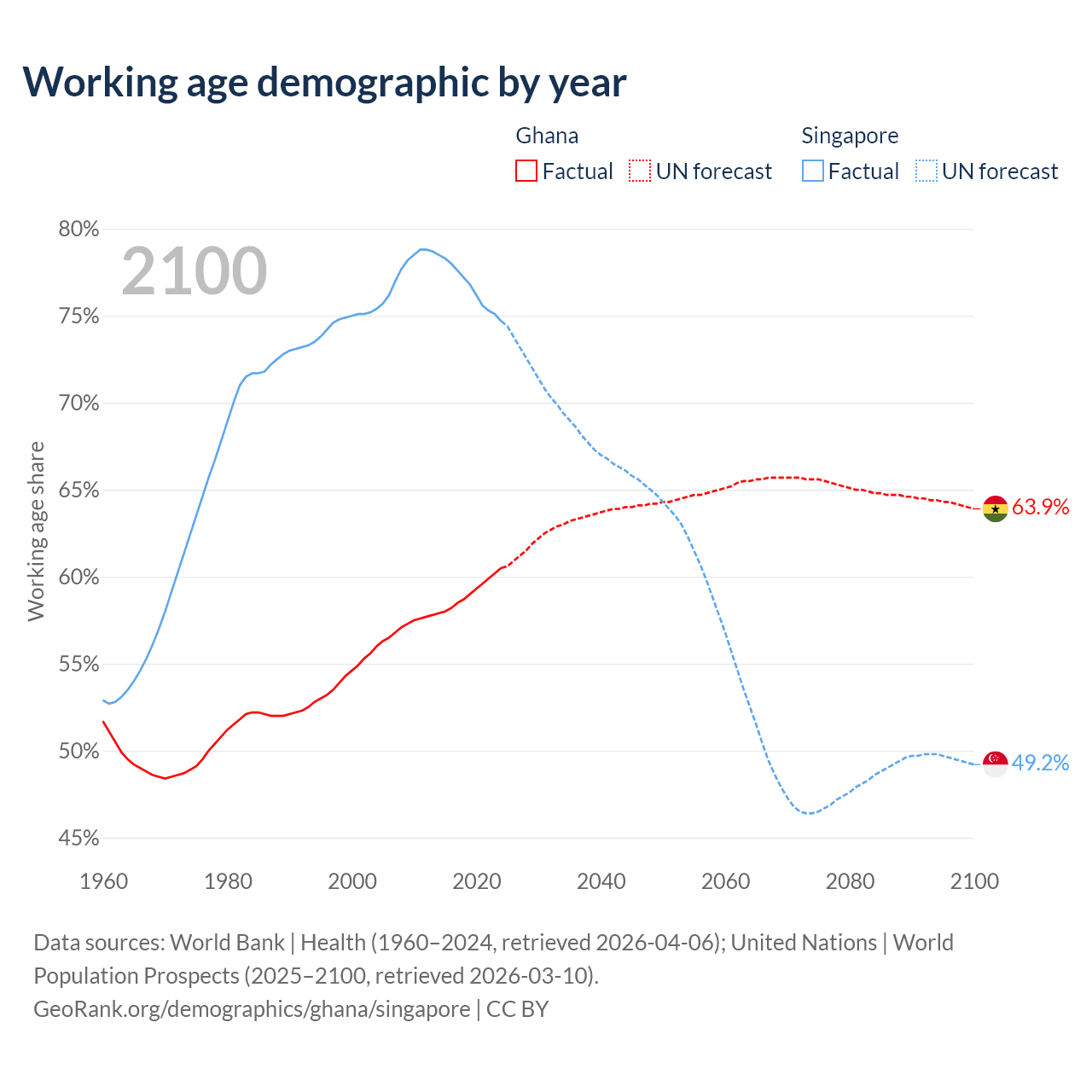 - Ghana has 21.7M working age adults (aged 15-64) vs 4.57M in Singapore.