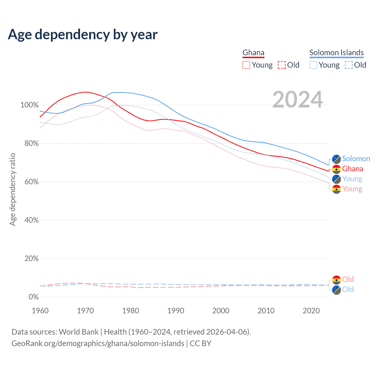 - Ghana is ranked 146/196 by median age (oldest to youngest) vs 153/196 for the Solomon Islands.