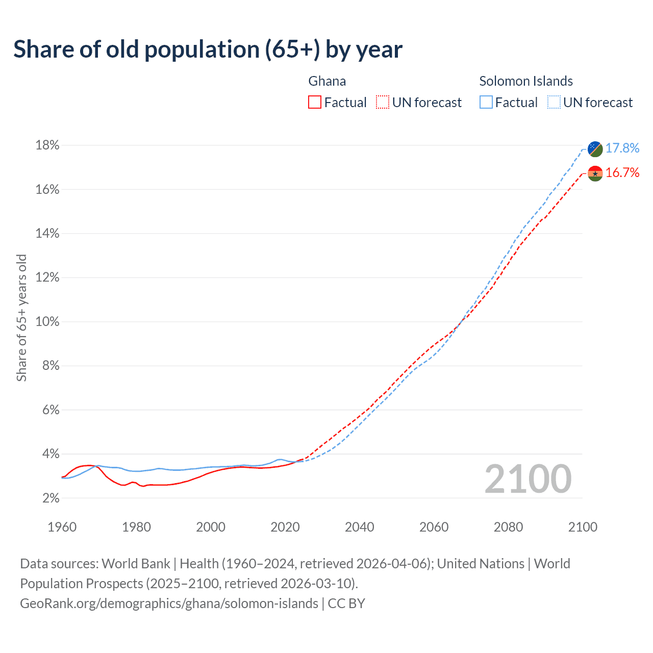 - The share of old-age demographic (65+) in Ghana is 3.71% vs 3.64% in the Solomon Islands.