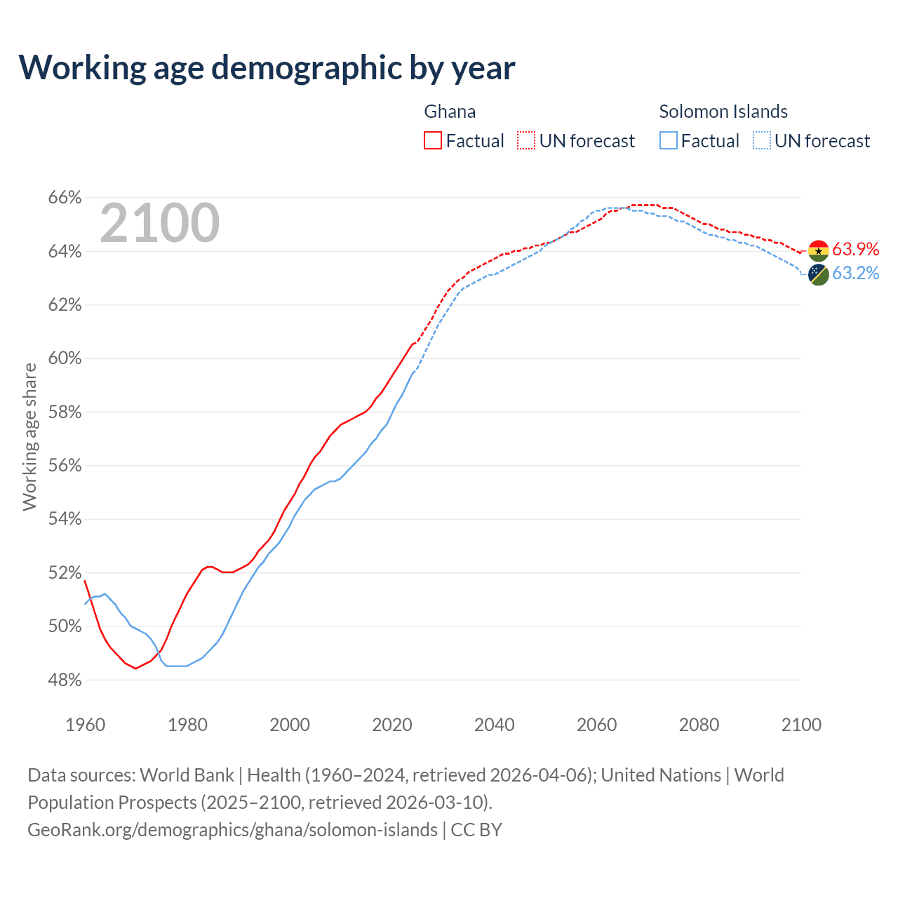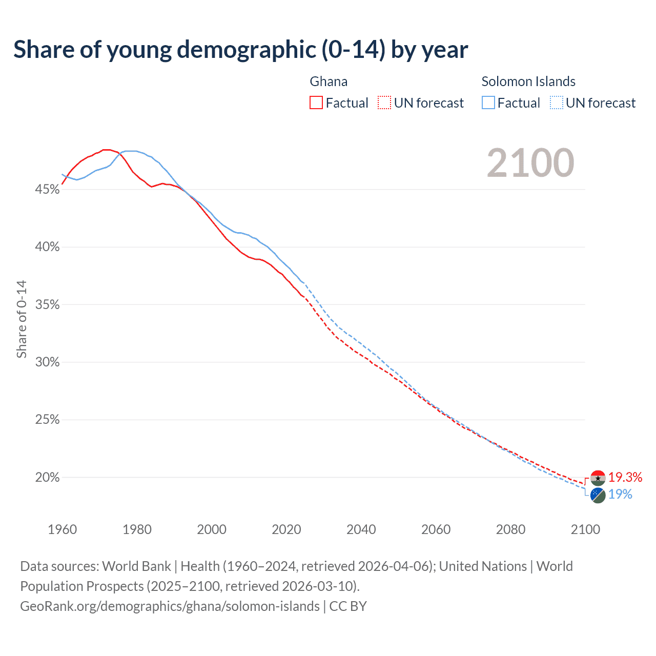 Median age Ghana vs Solomon Islands, 1960-2100