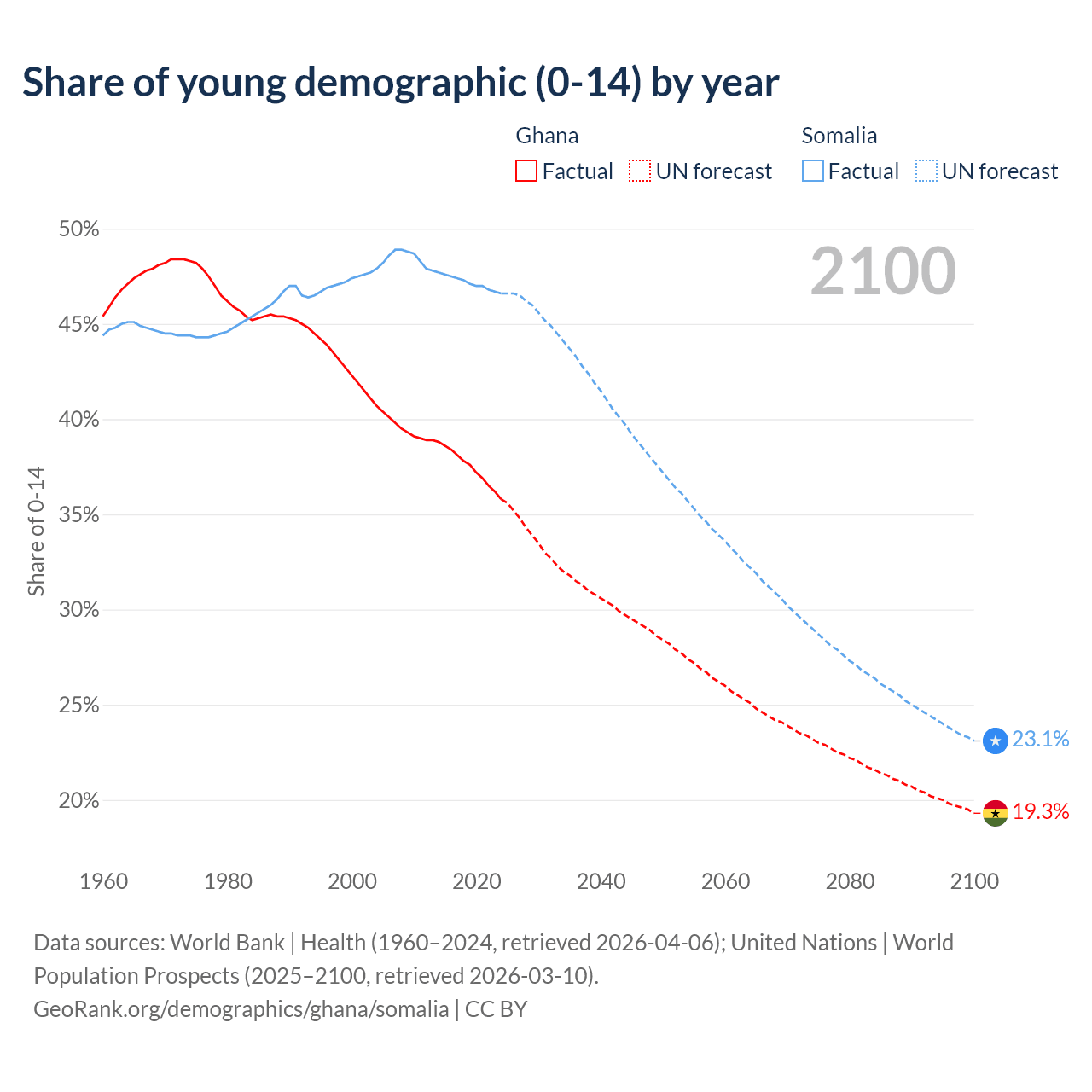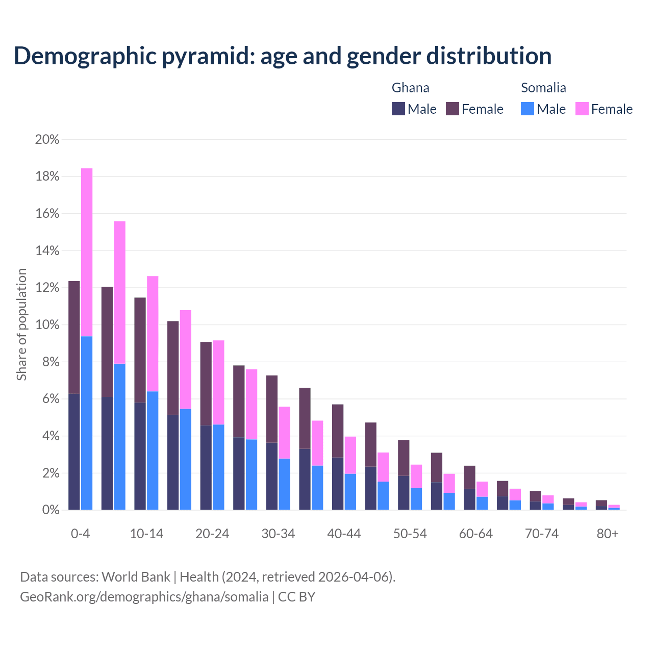- Ghana is ranked 146/196 by median age (oldest to youngest) vs 194/196 for Somalia.