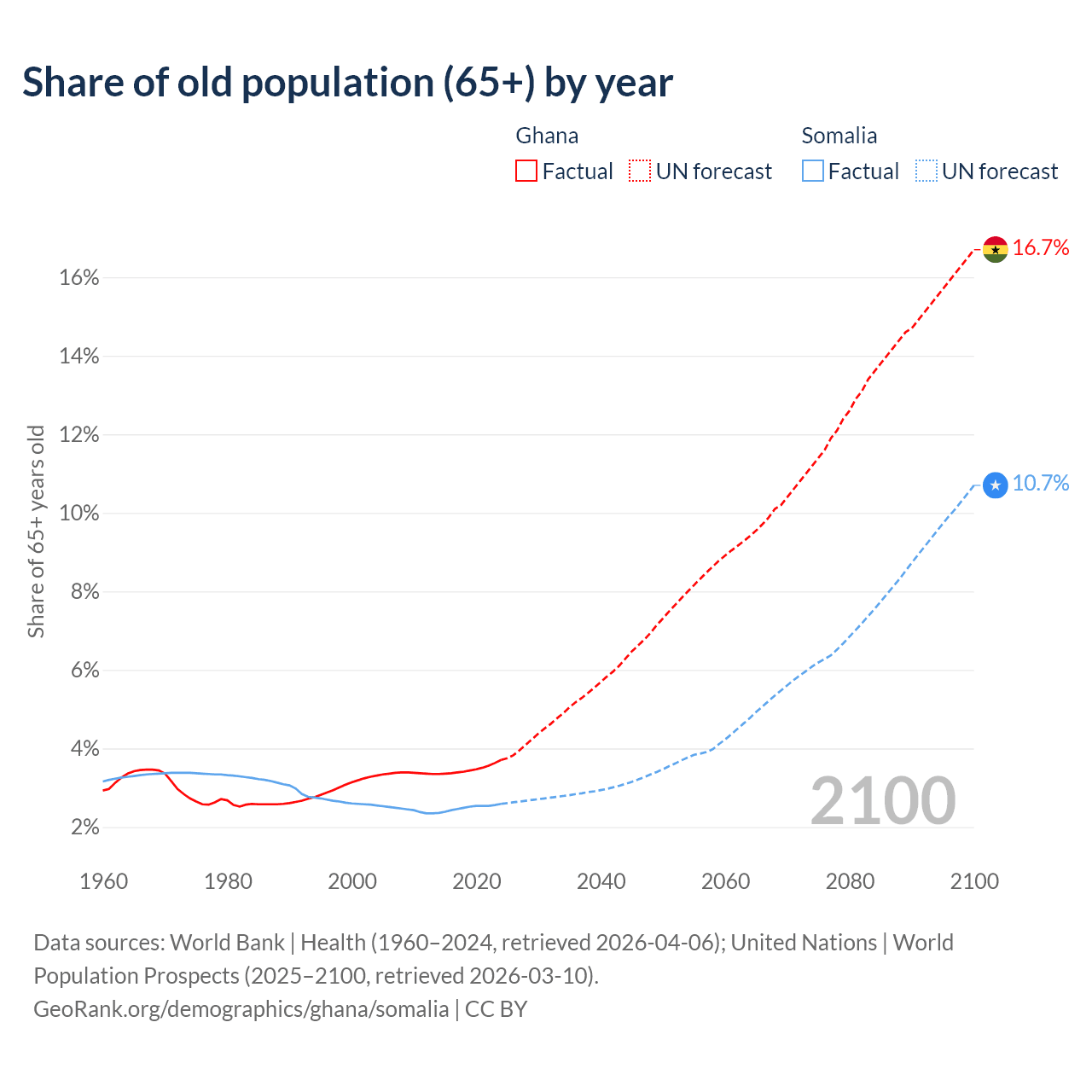 - The share of old-age demographic (65+) in Ghana is 3.71% vs 2.59% in Somalia.