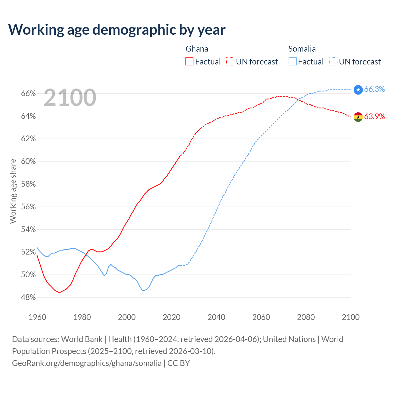 - Ghana has 21.7M working age adults (aged 15-64) vs 10.4M in Somalia.
