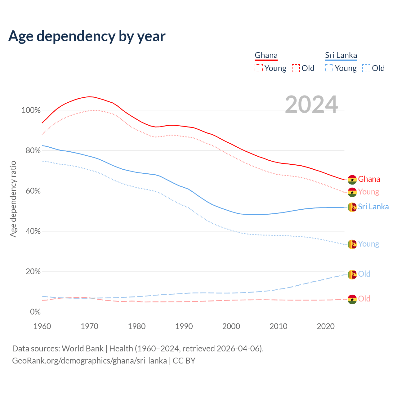 The share of older people aged 65 and over is 3.71% in Ghana and 12.1% in Sri Lanka. Life expectancy in Ghana compared to Sri Lanka .