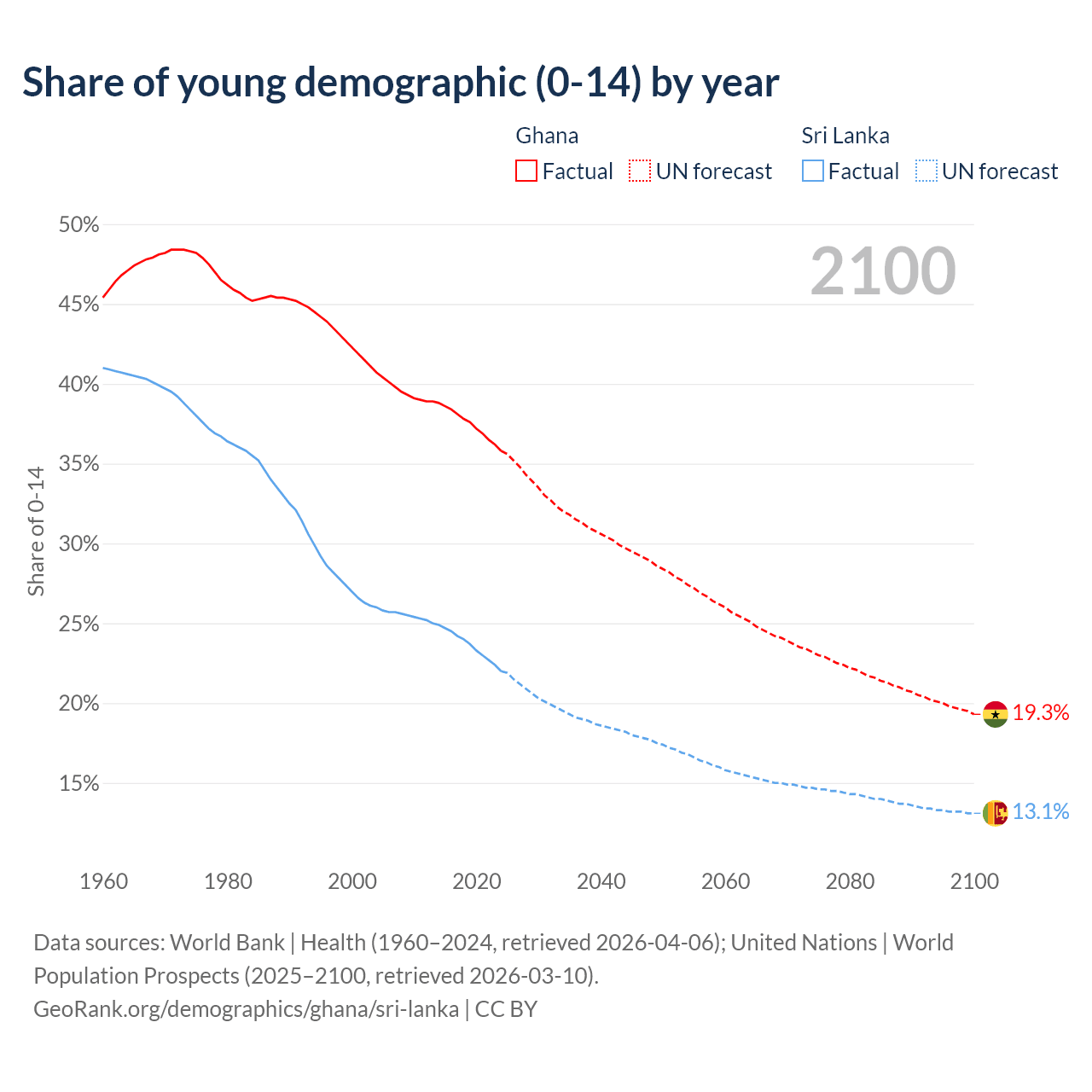 - Ghana is ranked 146/196 by median age (oldest to youngest) vs 81/196 for Sri Lanka.