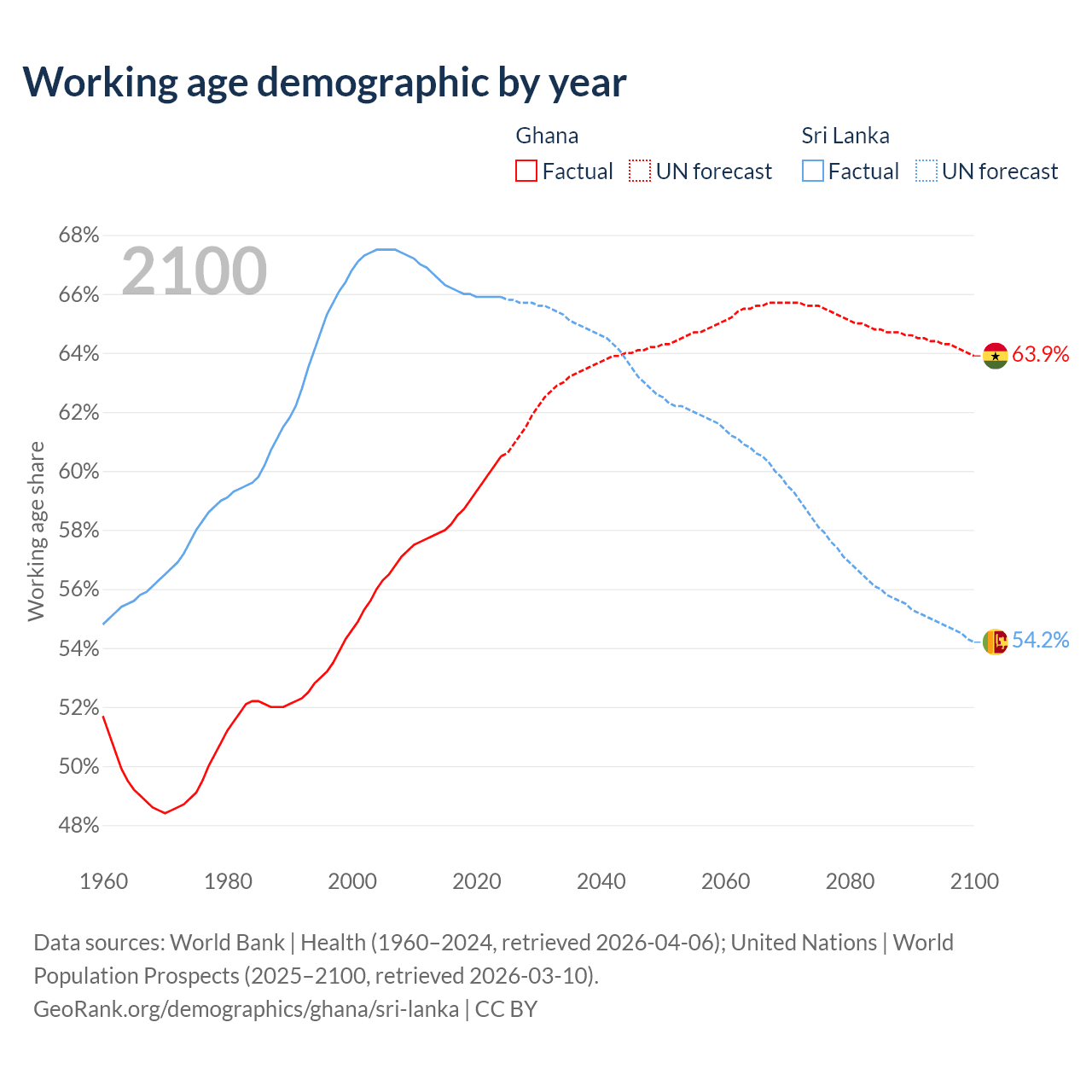 - Ghana has 21.7M working age adults (aged 15-64) vs 14.6M in Sri Lanka.