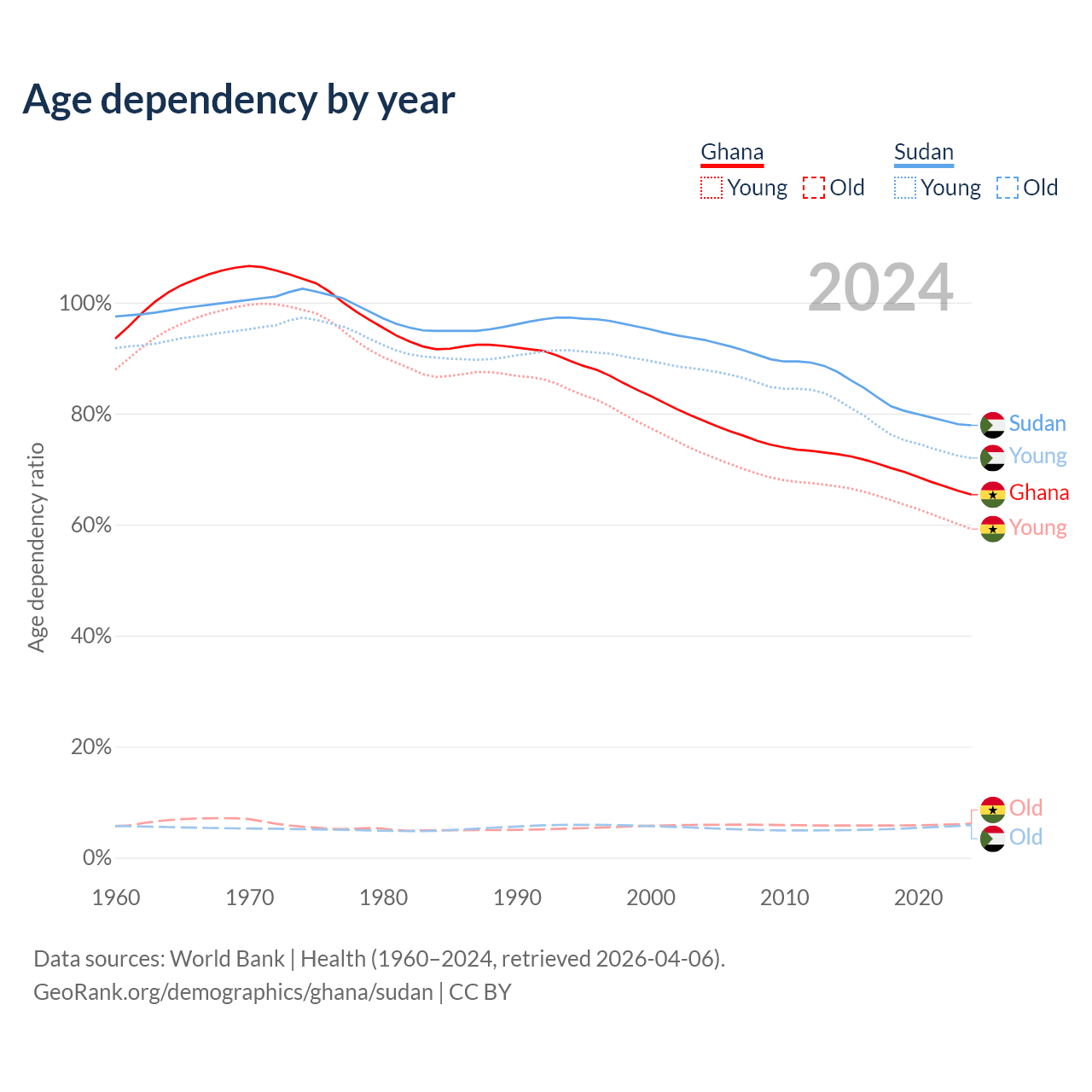 - Ghana is ranked 146/196 by median age (oldest to youngest) vs 172/196 for Sudan.
