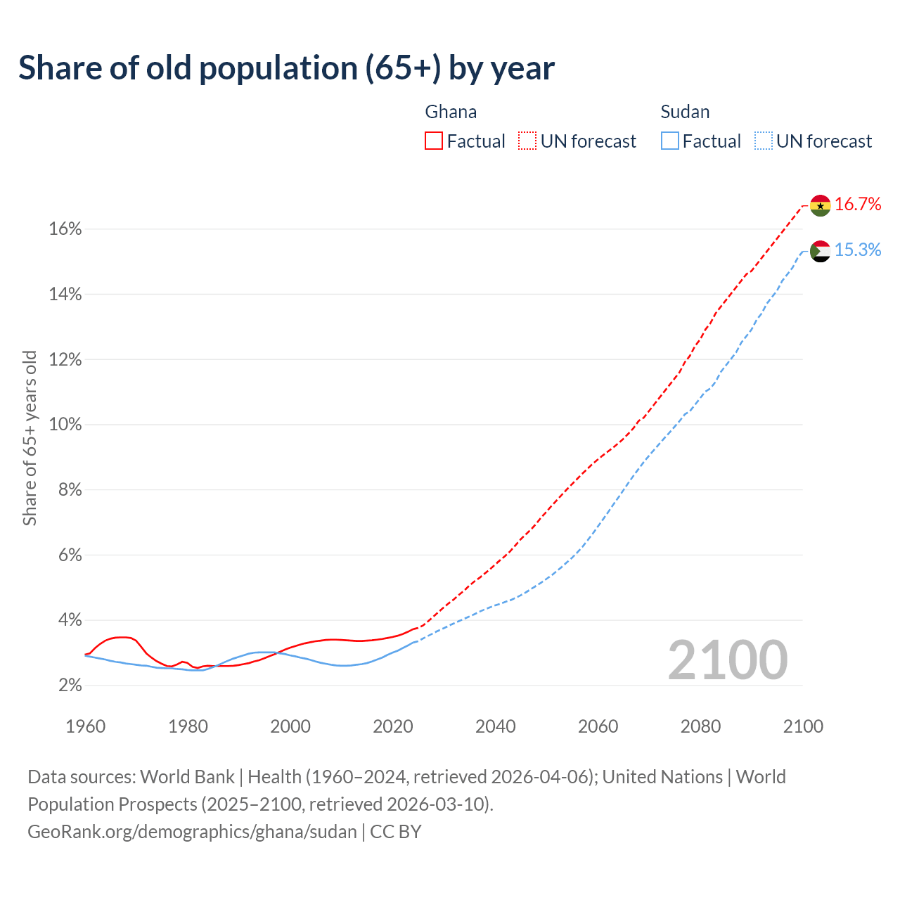 The share of older people aged 65 and over is 3.71% in Ghana and 3.3% in Sudan. Life expectancy in Ghana compared to Sudan .