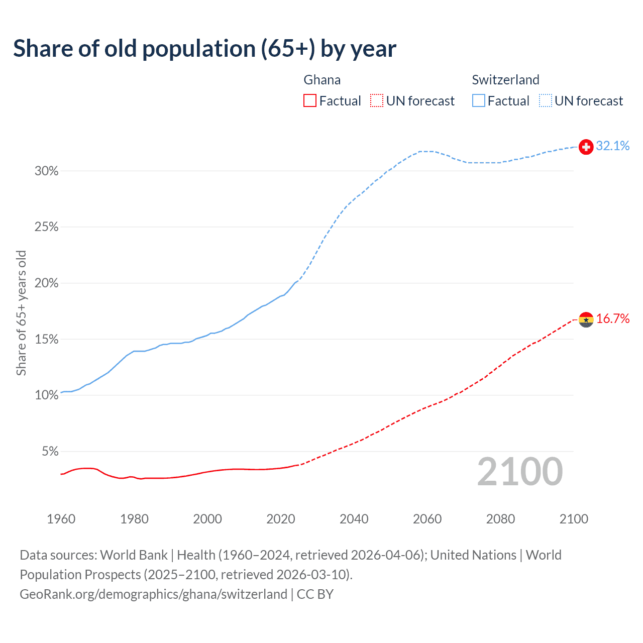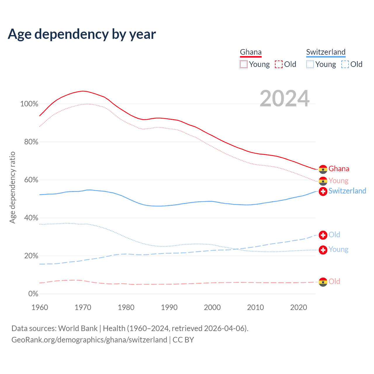 The share of older people aged 65 and over is 3.71% in Ghana and 20% in Switzerland. Life expectancy in Ghana compared to Switzerland .