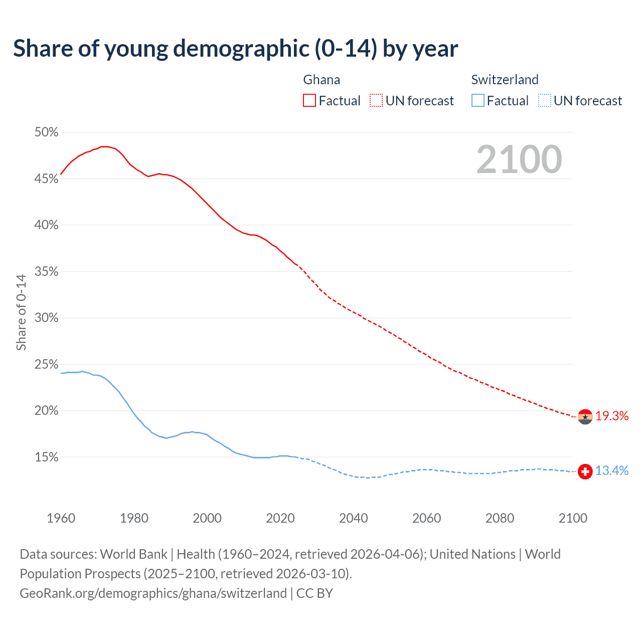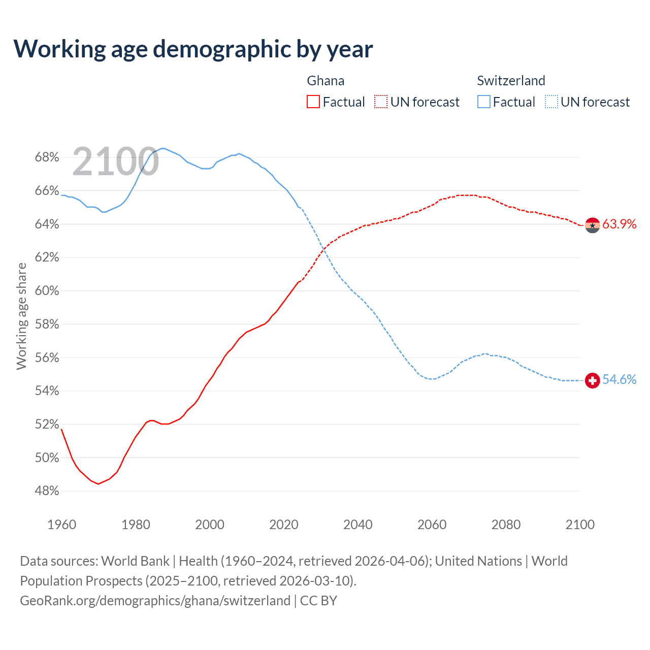 Median age Ghana vs Switzerland, 1960-2100