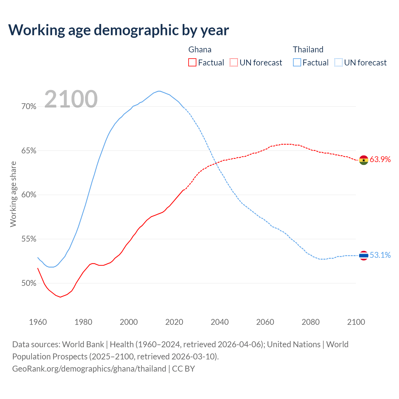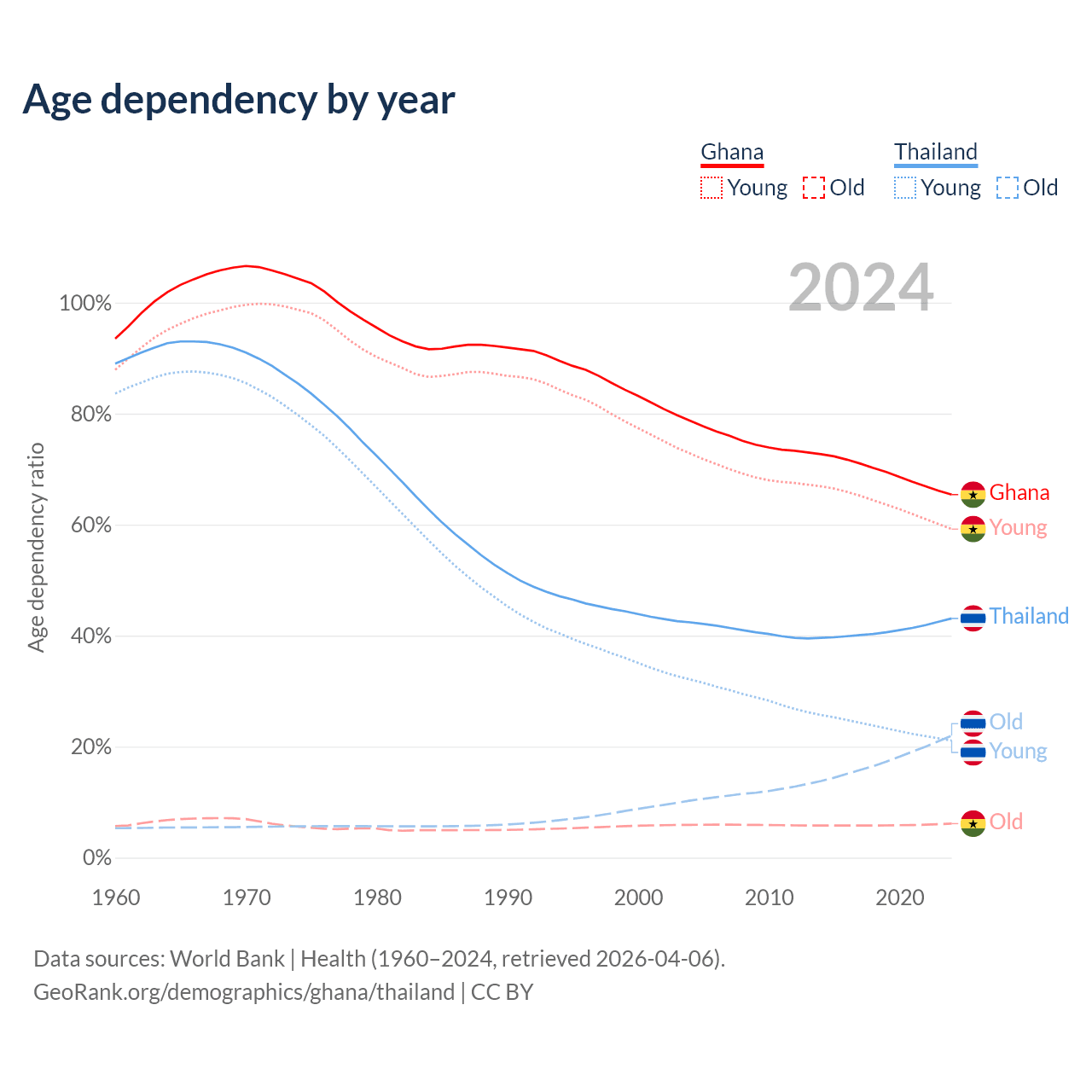 The share of older people aged 65 and over is 3.71% in Ghana and 15.4% in Thailand. Life expectancy in Ghana compared to Thailand .