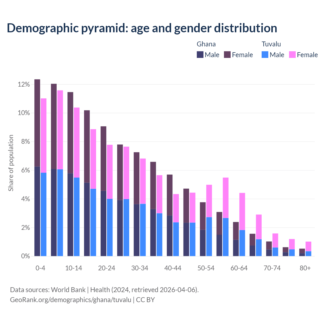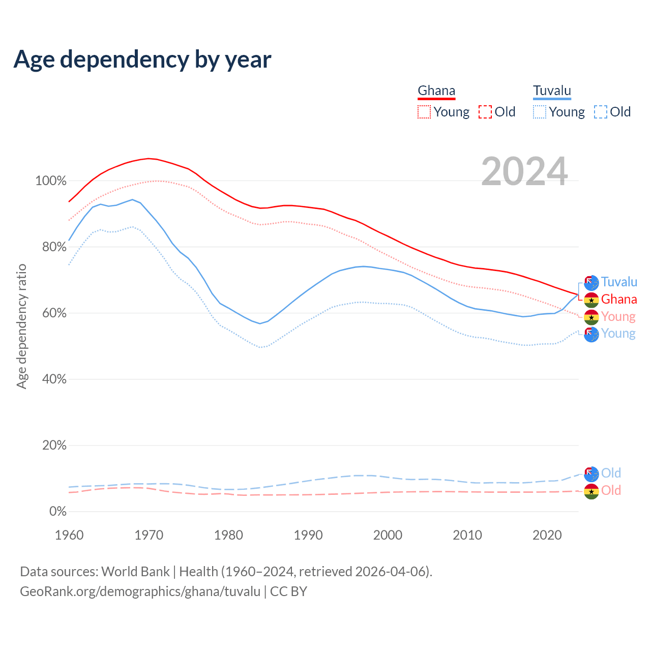 - The share of old-age demographic (65+) in Ghana is 3.71% vs 6.67% in Tuvalu.