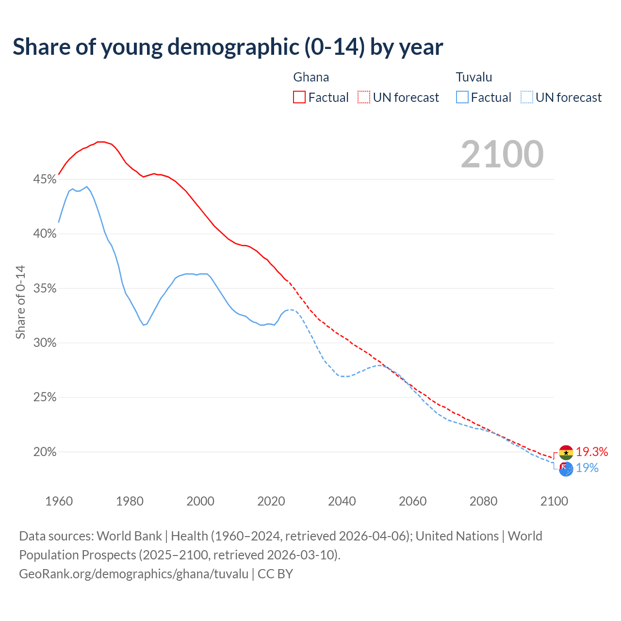 - The share of young demographic (0-15 years old) in Ghana is 35.8% vs 32.9% in Tuvalu.