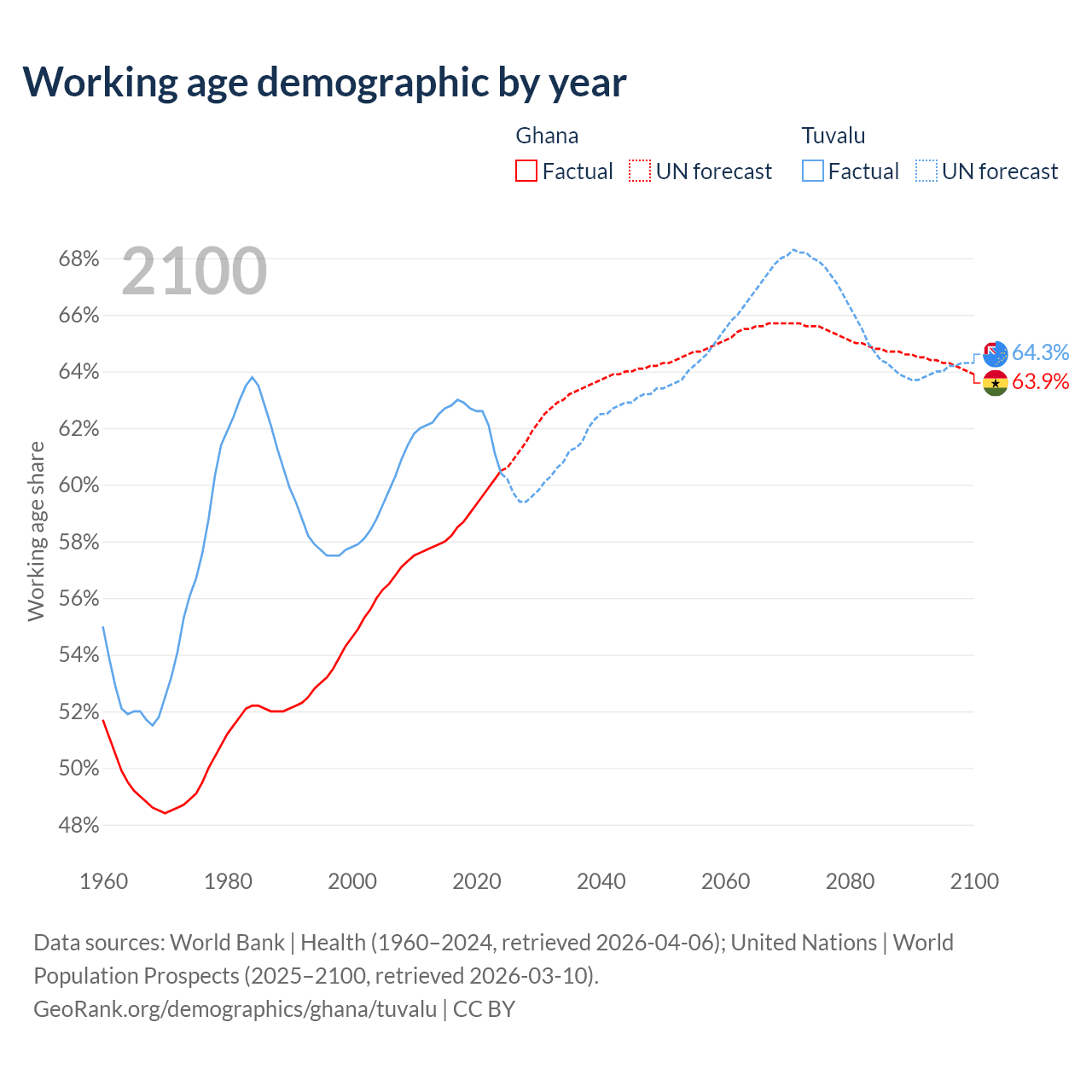 - Ghana has 21.7M working age adults (aged 15-64) vs 5.64K in Tuvalu.