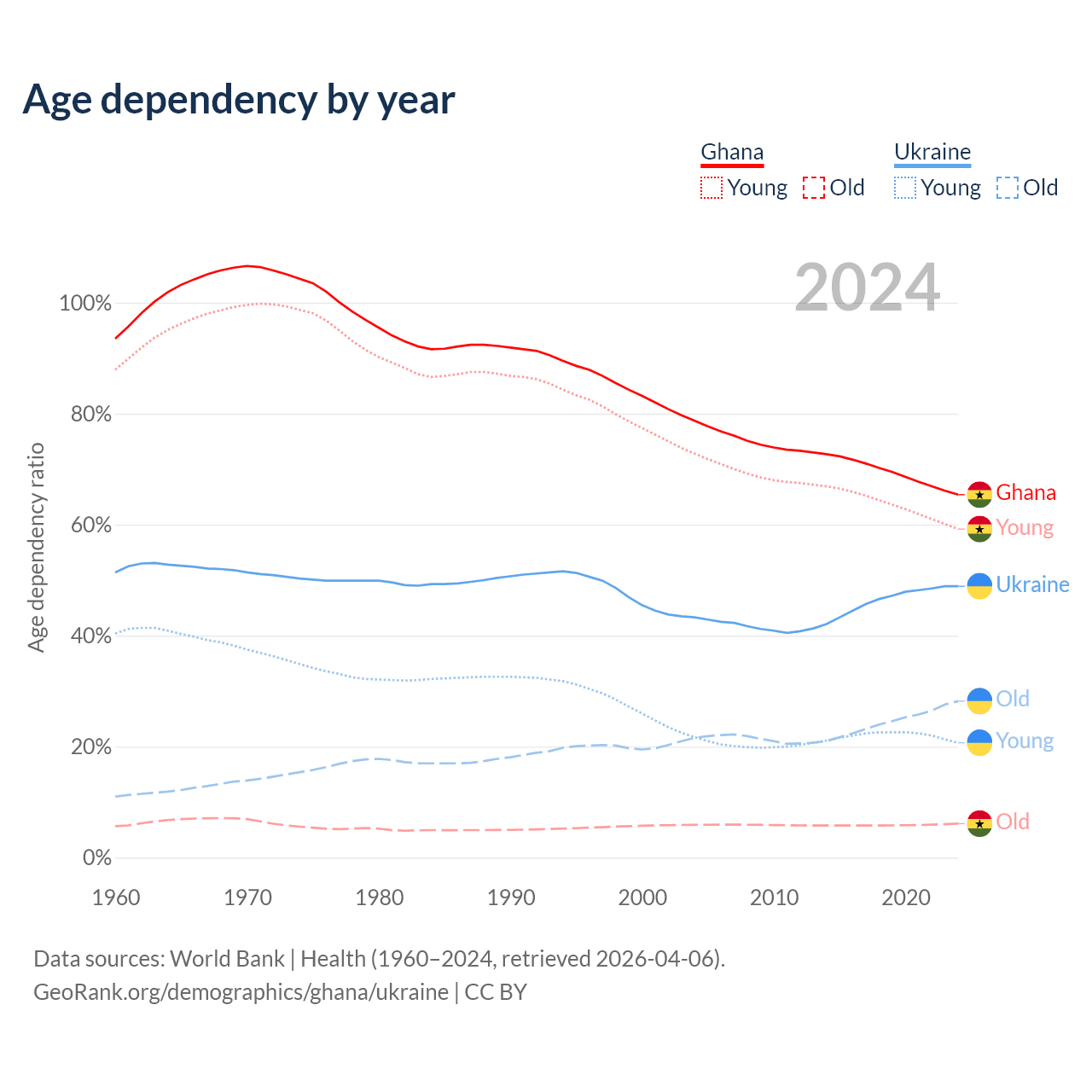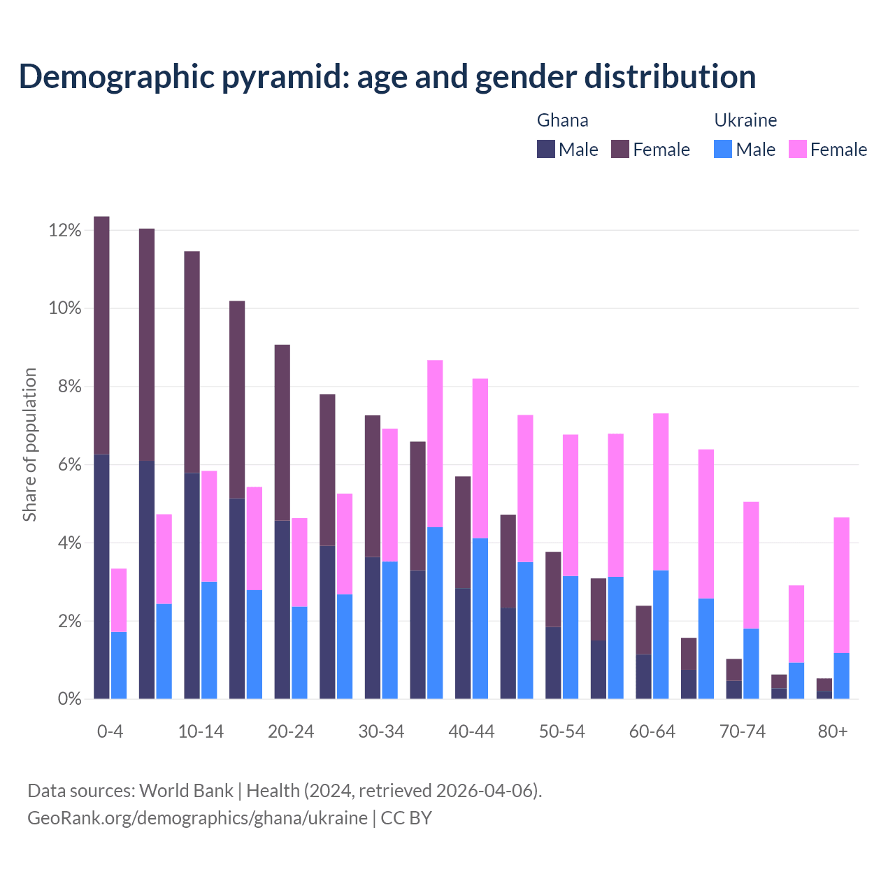 - Ghana is ranked 146/196 by median age (oldest to youngest) vs 26/196 for Ukraine.