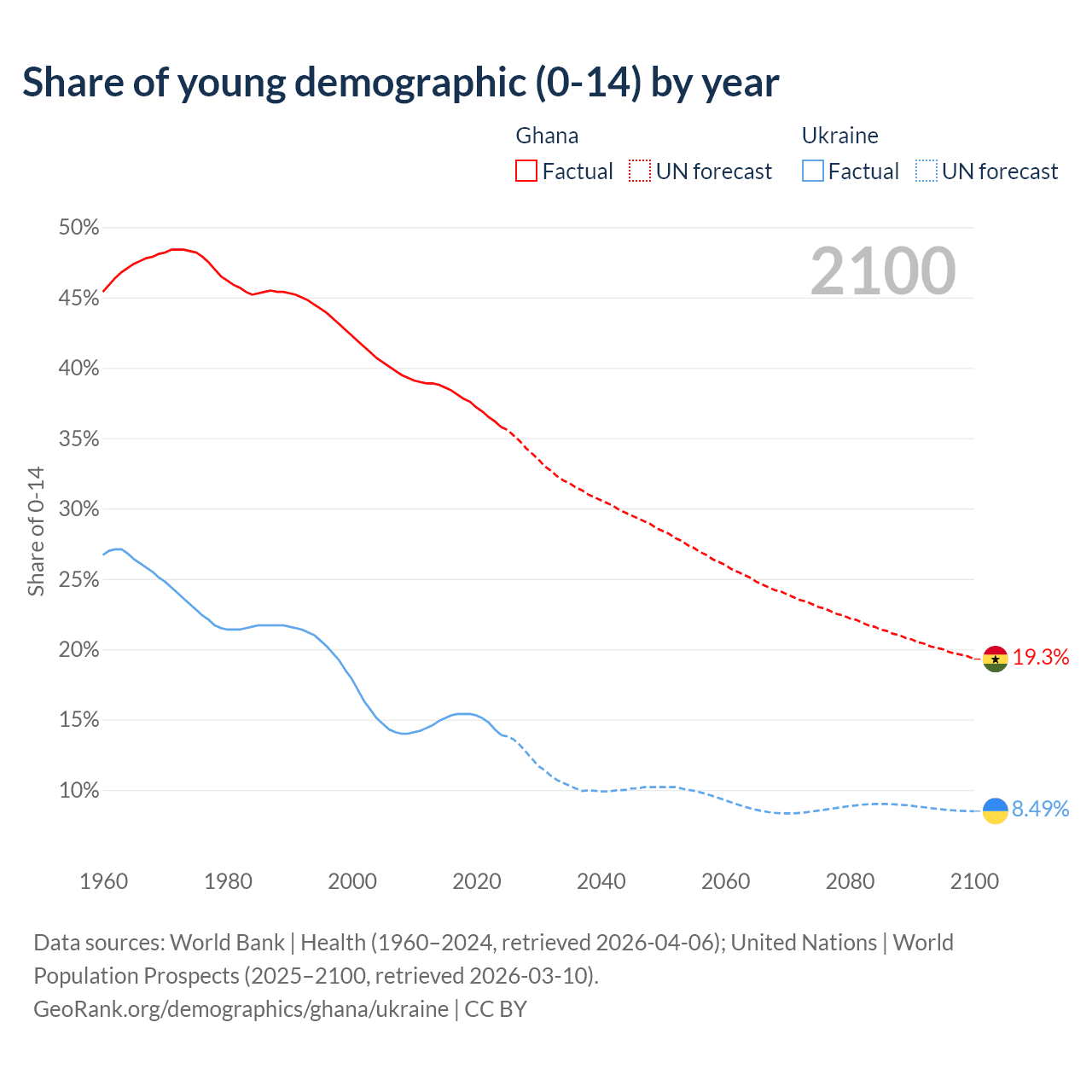 - The share of young demographic (0-15 years old) in Ghana is 35.8% vs 13.9% in Ukraine.
