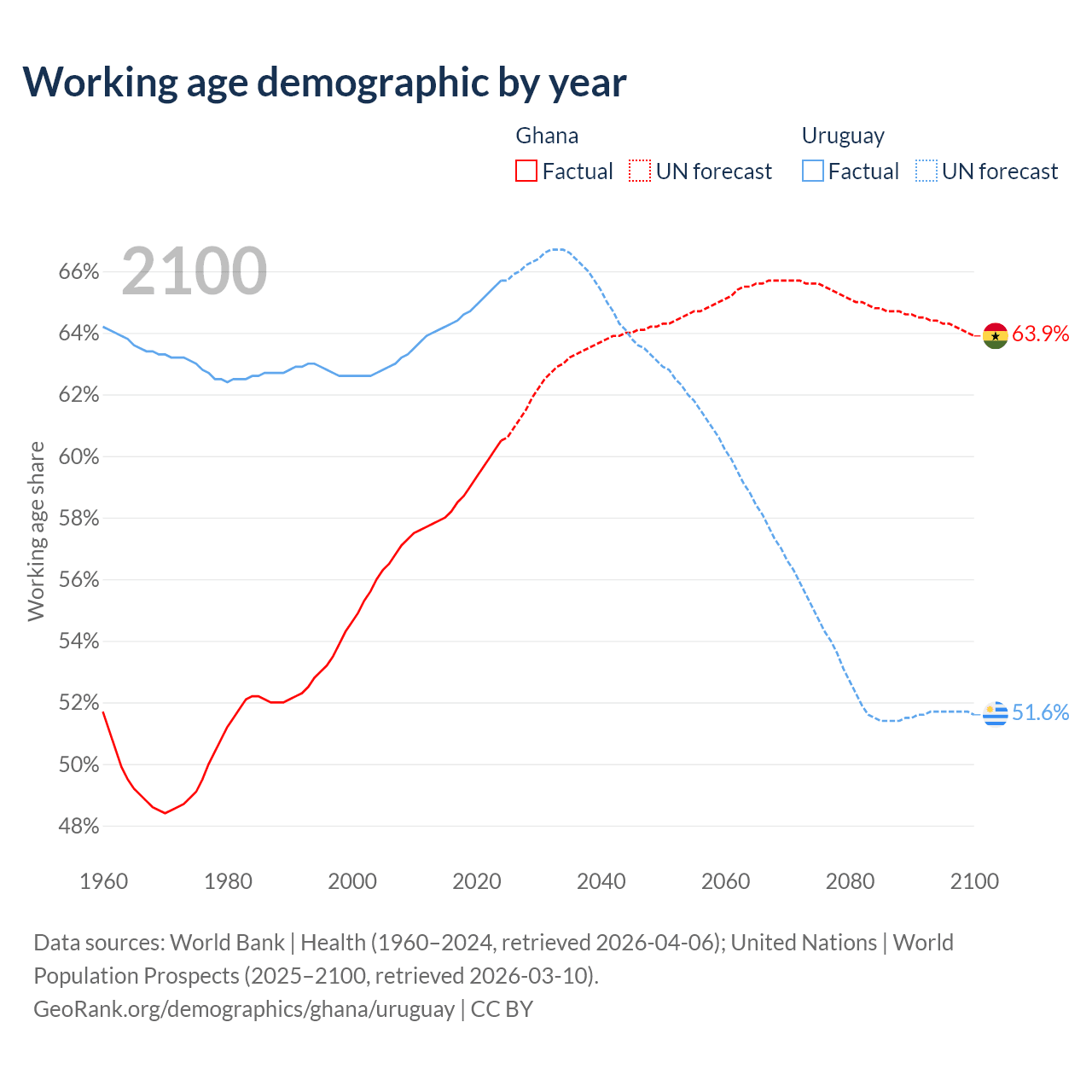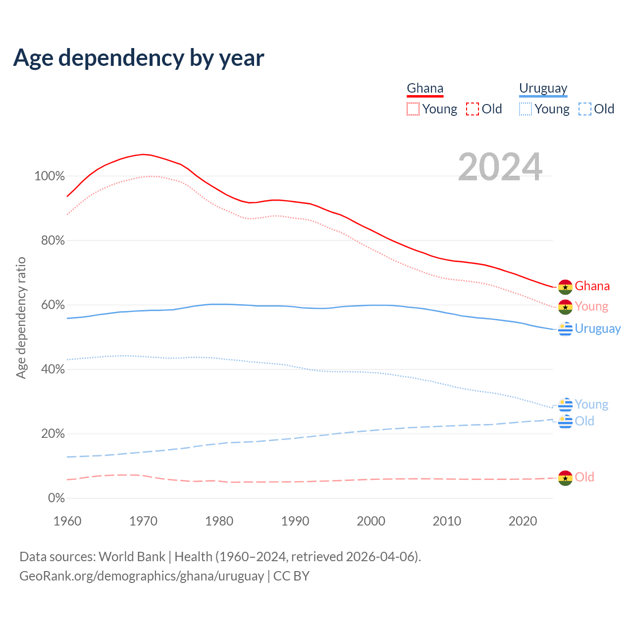 The share of older people aged 65 and over is 3.71% in Ghana and 16% in Uruguay. Life expectancy in Ghana compared to Uruguay .