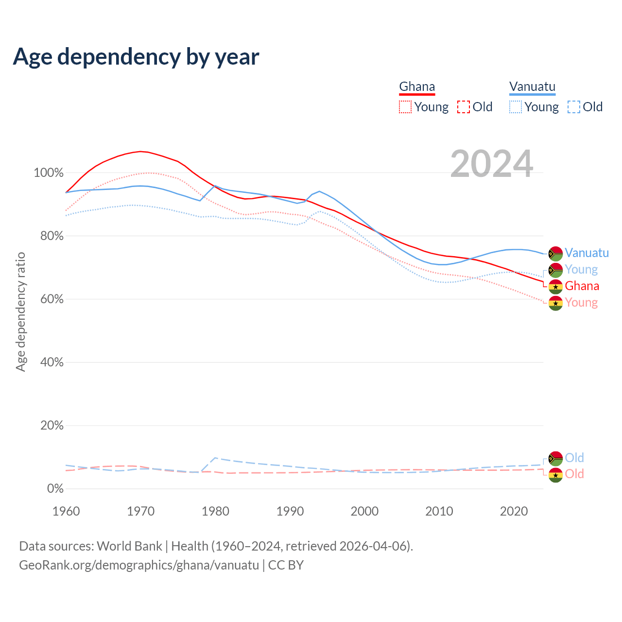 The share of older people aged 65 and over is 3.71% in Ghana and 4.3% in Vanuatu. Life expectancy in Ghana compared to Vanuatu .