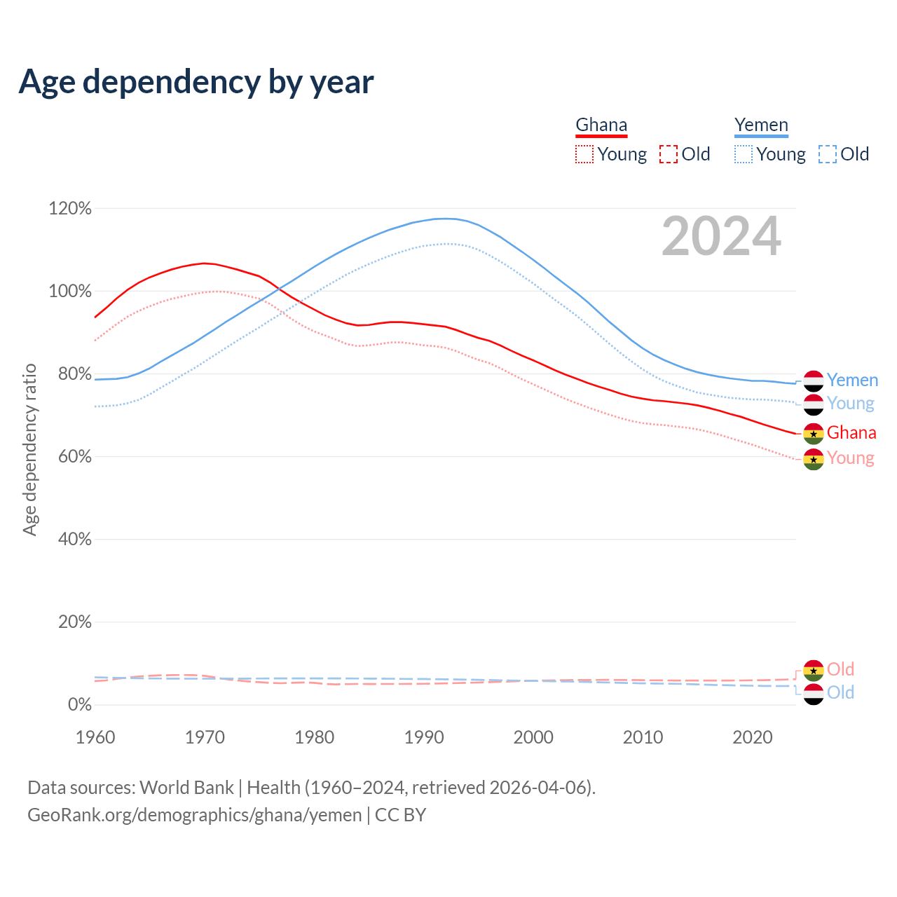 - The share of old-age demographic (65+) in Ghana is 3.71% vs 2.52% in Yemen.