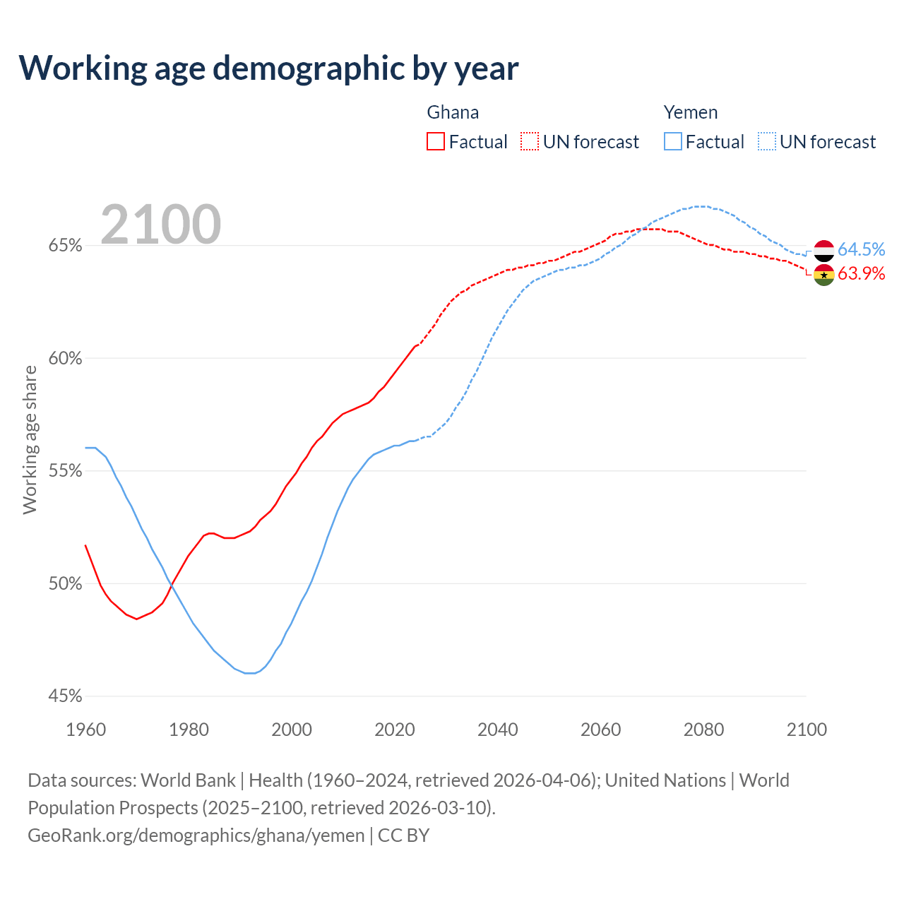 - Ghana has 21.7M working age adults (aged 15-64) vs 24.4M in Yemen.