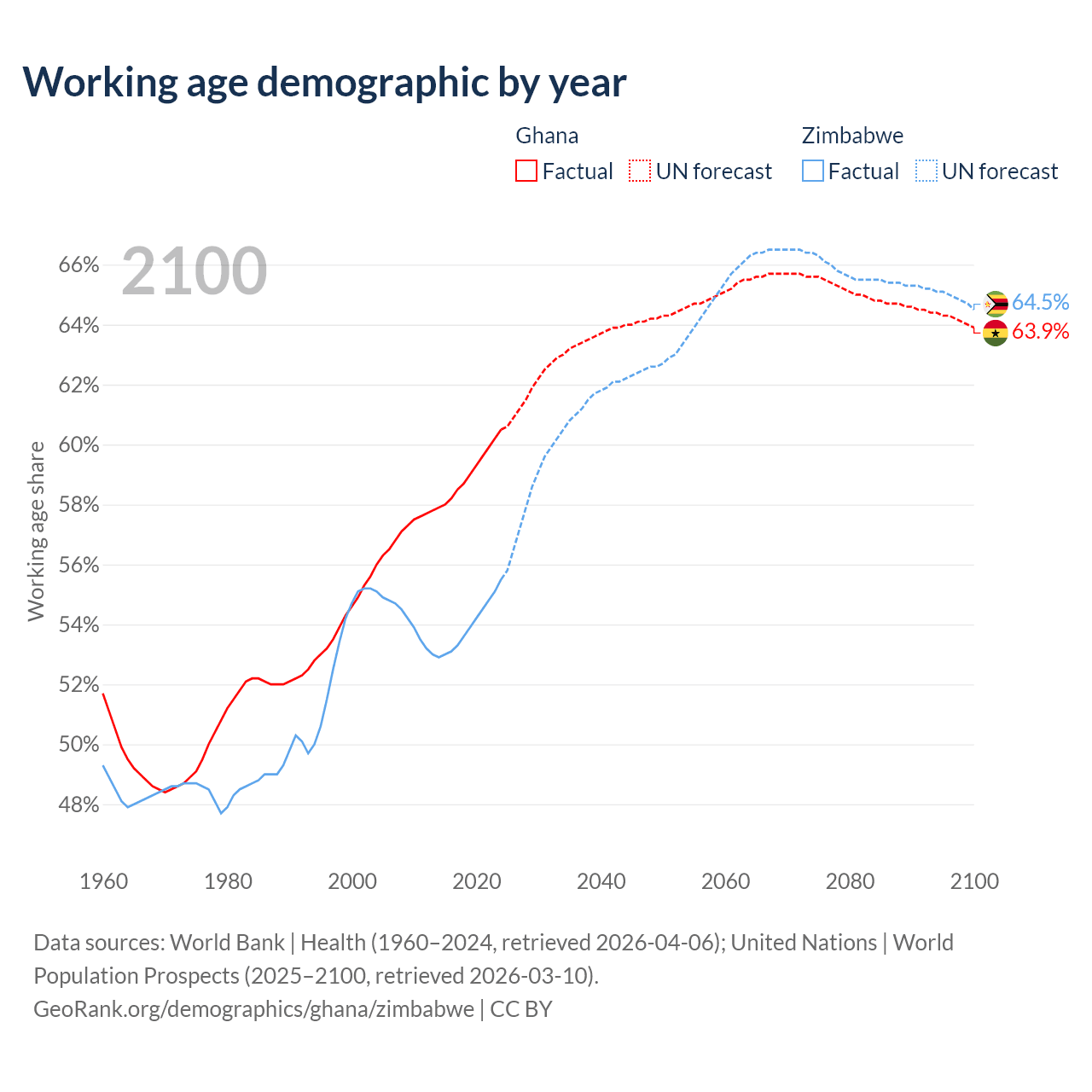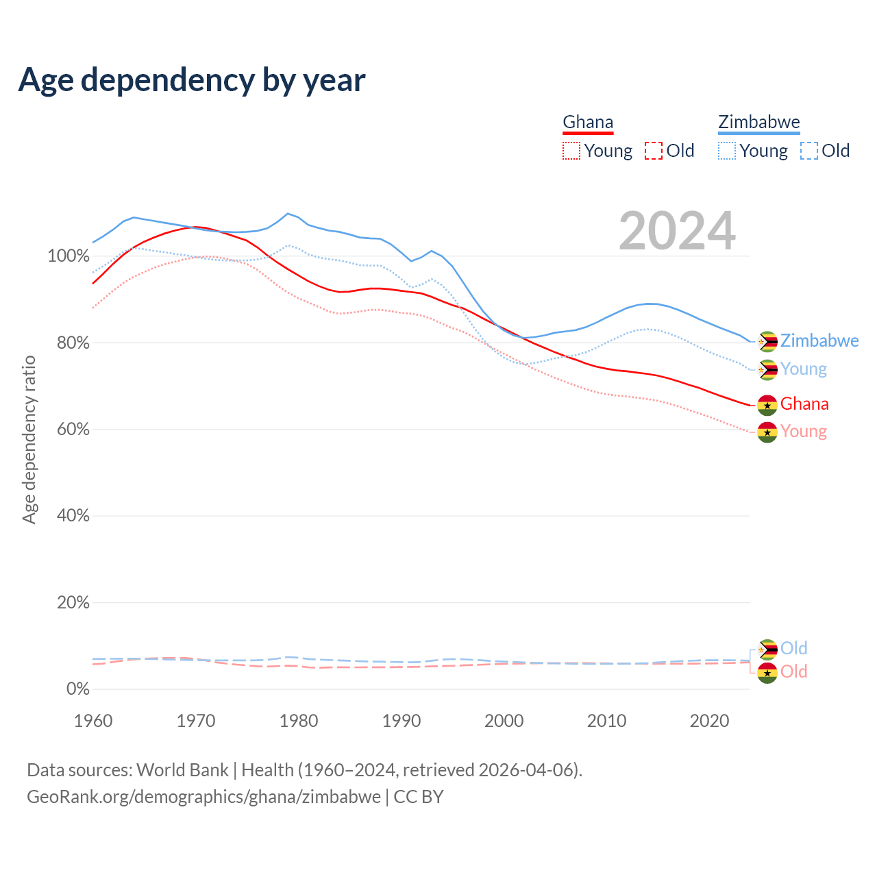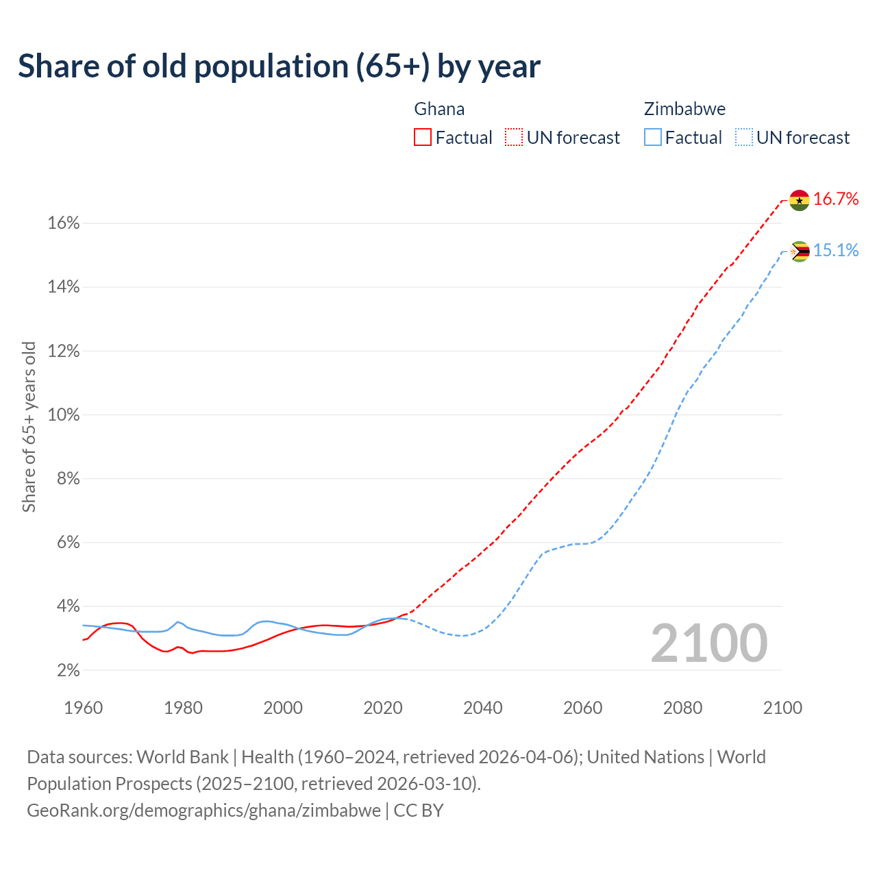 The share of older people aged 65 and over is 3.71% in Ghana and 3.6% in Zimbabwe. Life expectancy in Ghana compared to Zimbabwe .