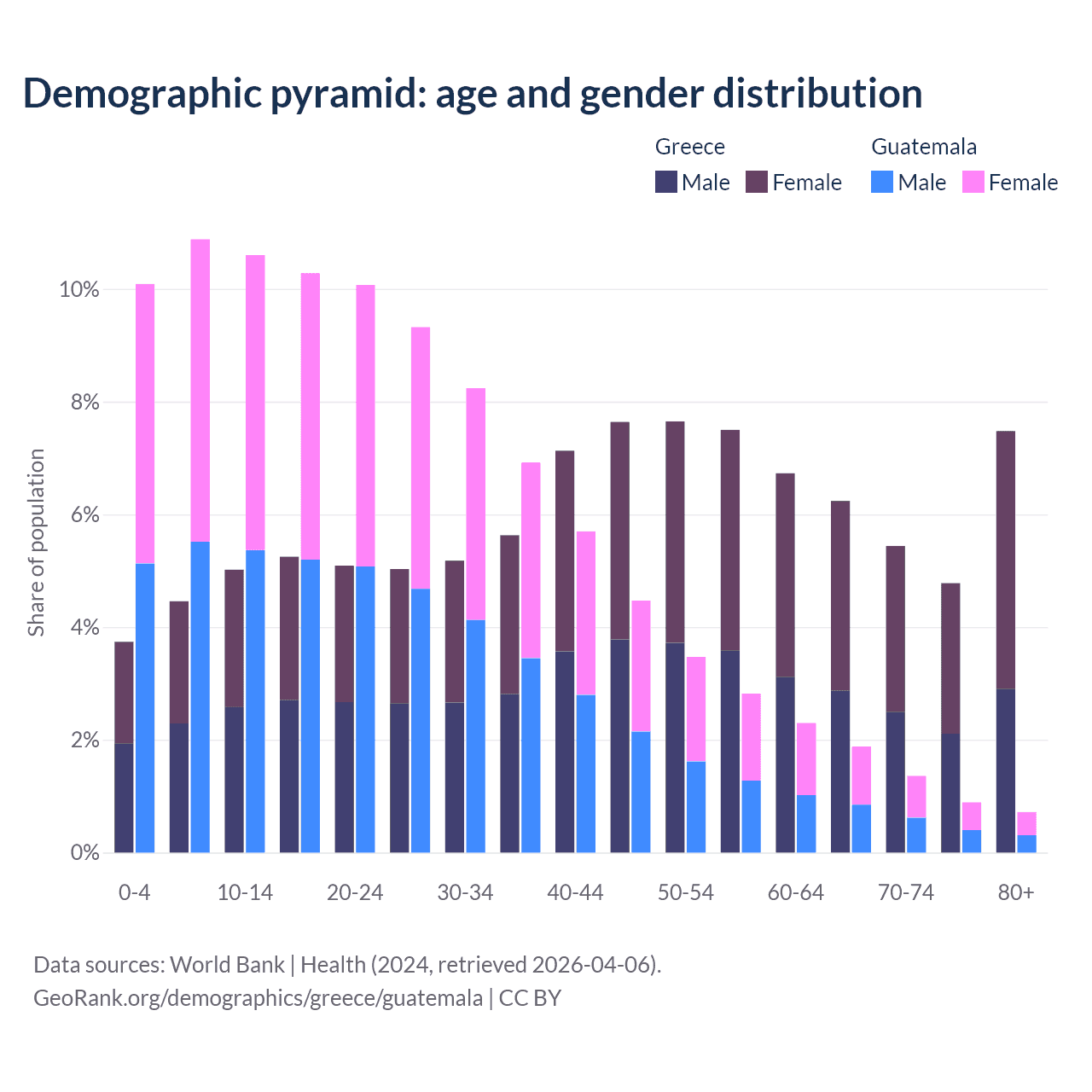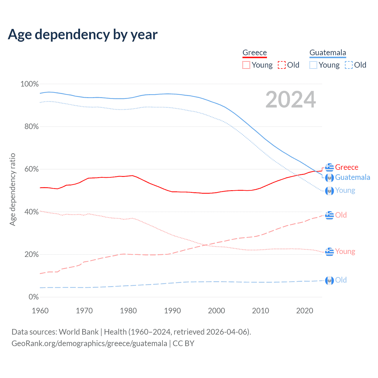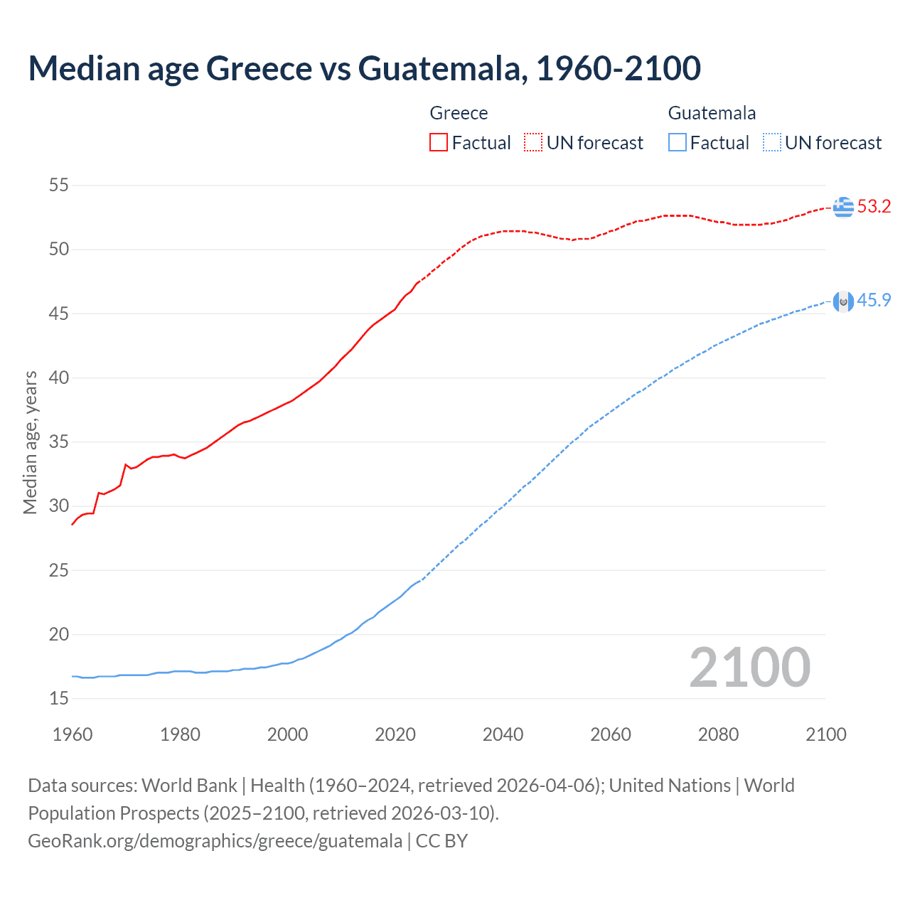 - Greece is ranked 6/196 by median age (oldest to youngest) vs 137/196 for Guatemala.
