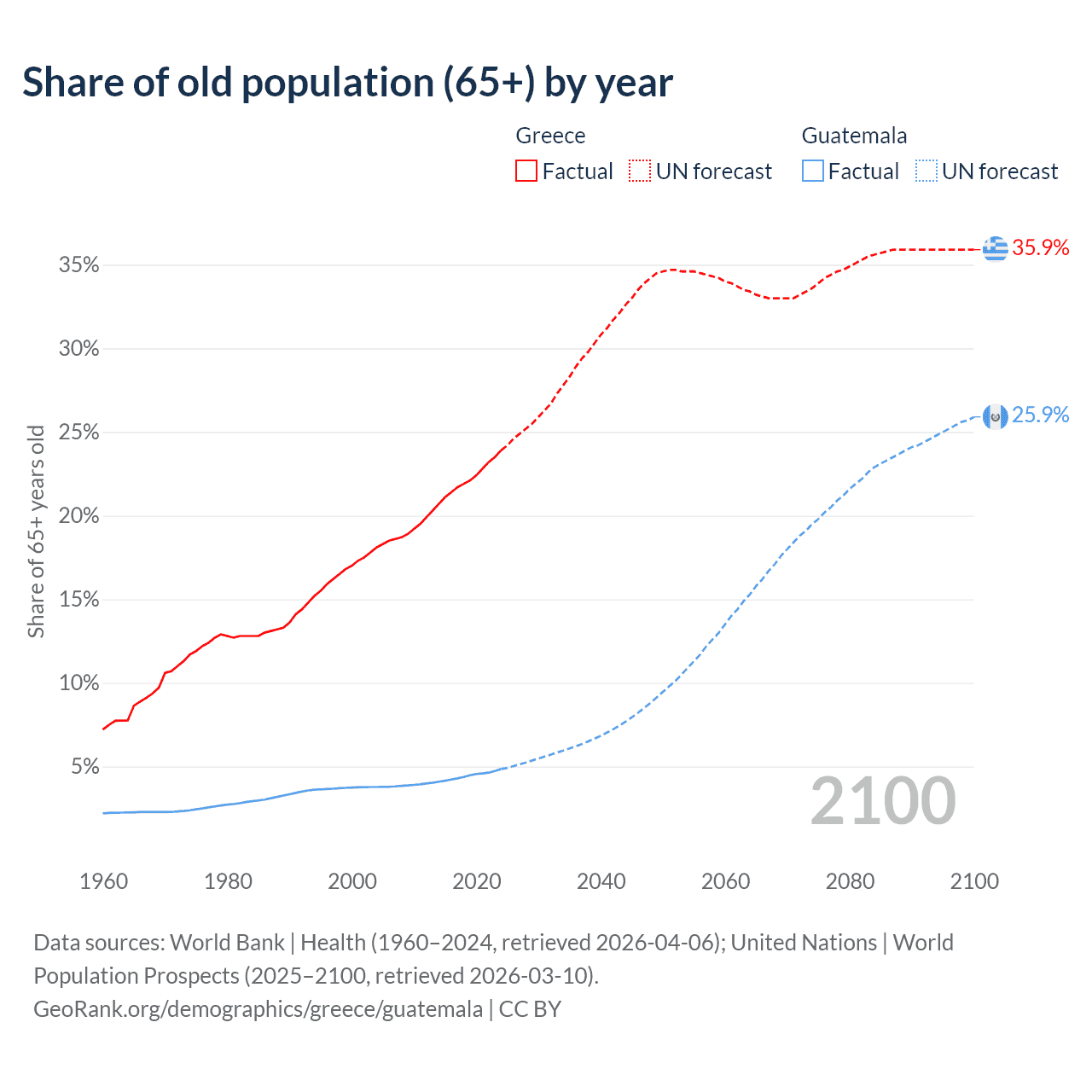 - The share of old-age demographic (65+) in Greece is 23.9% vs 4.85% in Guatemala.