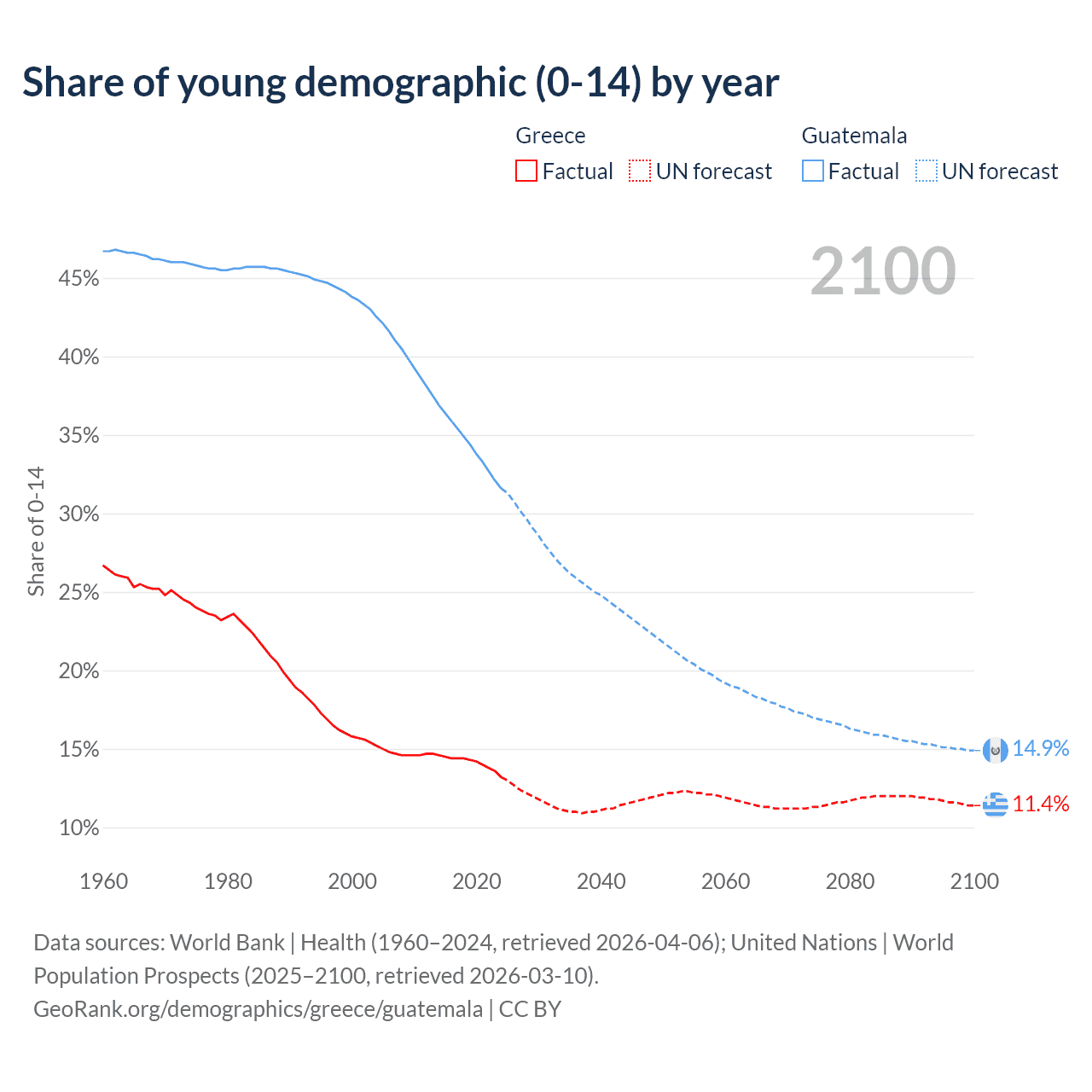 - The share of young demographic (0-15 years old) in Greece is 13.2% vs 31.6% in Guatemala.