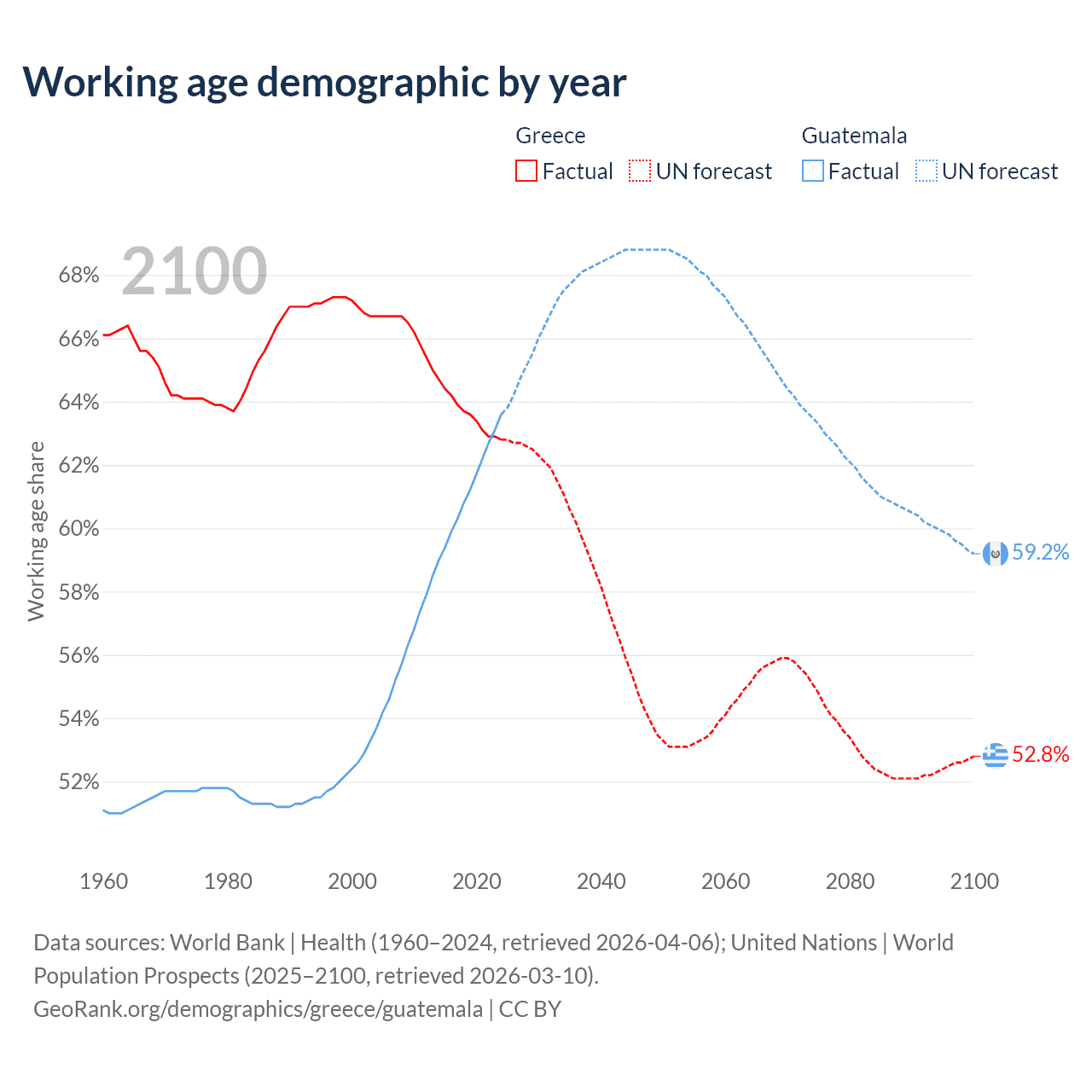 - Greece has 6.4M working age adults (aged 15-64) vs 12.1M in Guatemala.