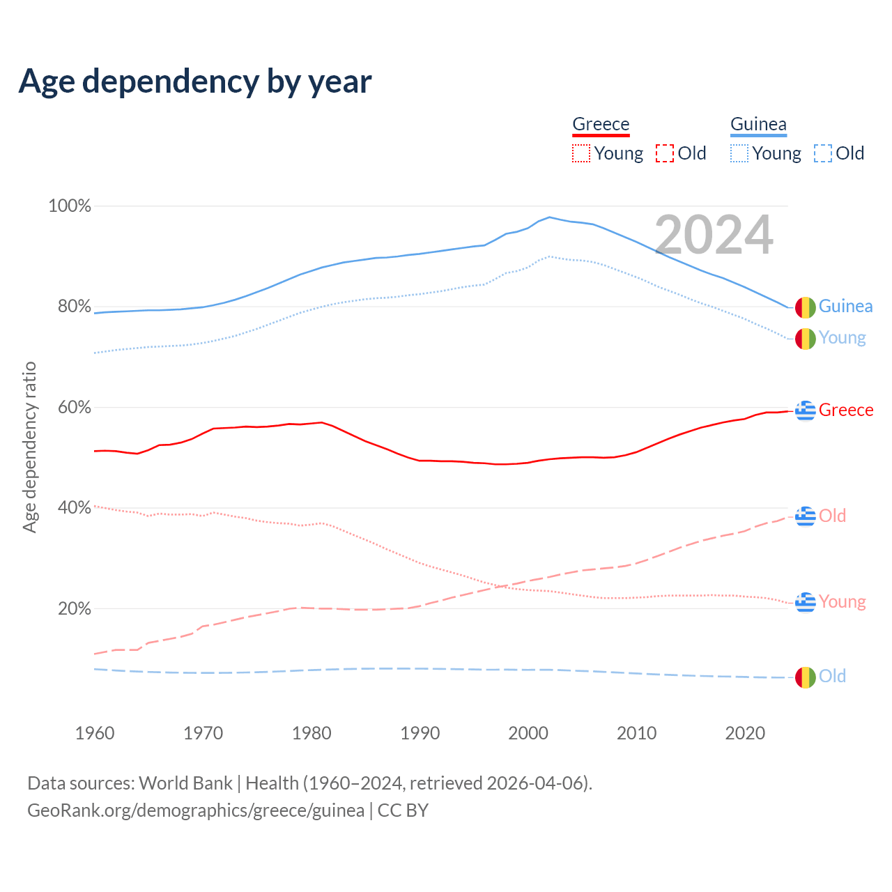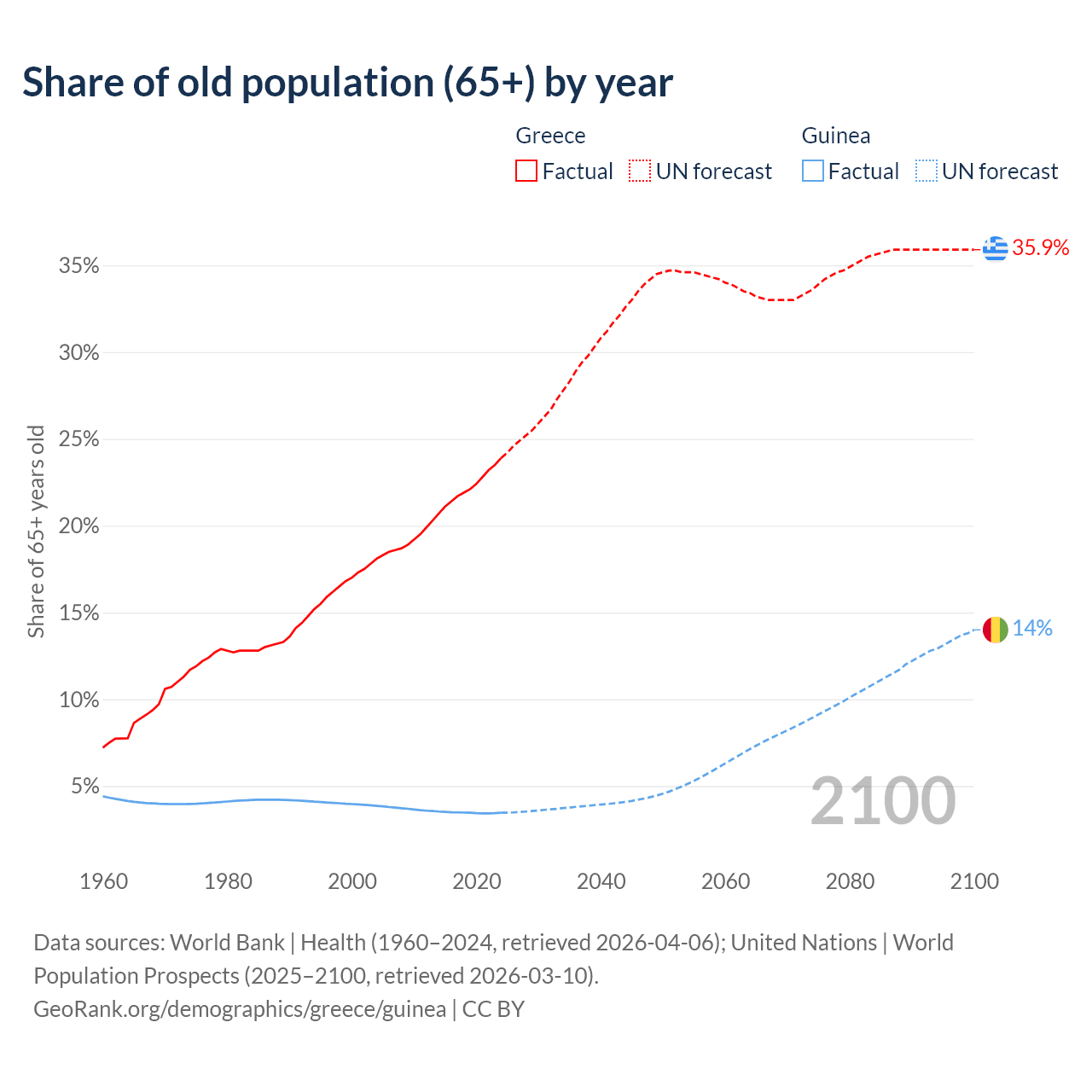 The share of older people aged 65 and over is 23.9% in Greece and 3.46% in Guinea. Life expectancy in Greece compared to Guinea .
